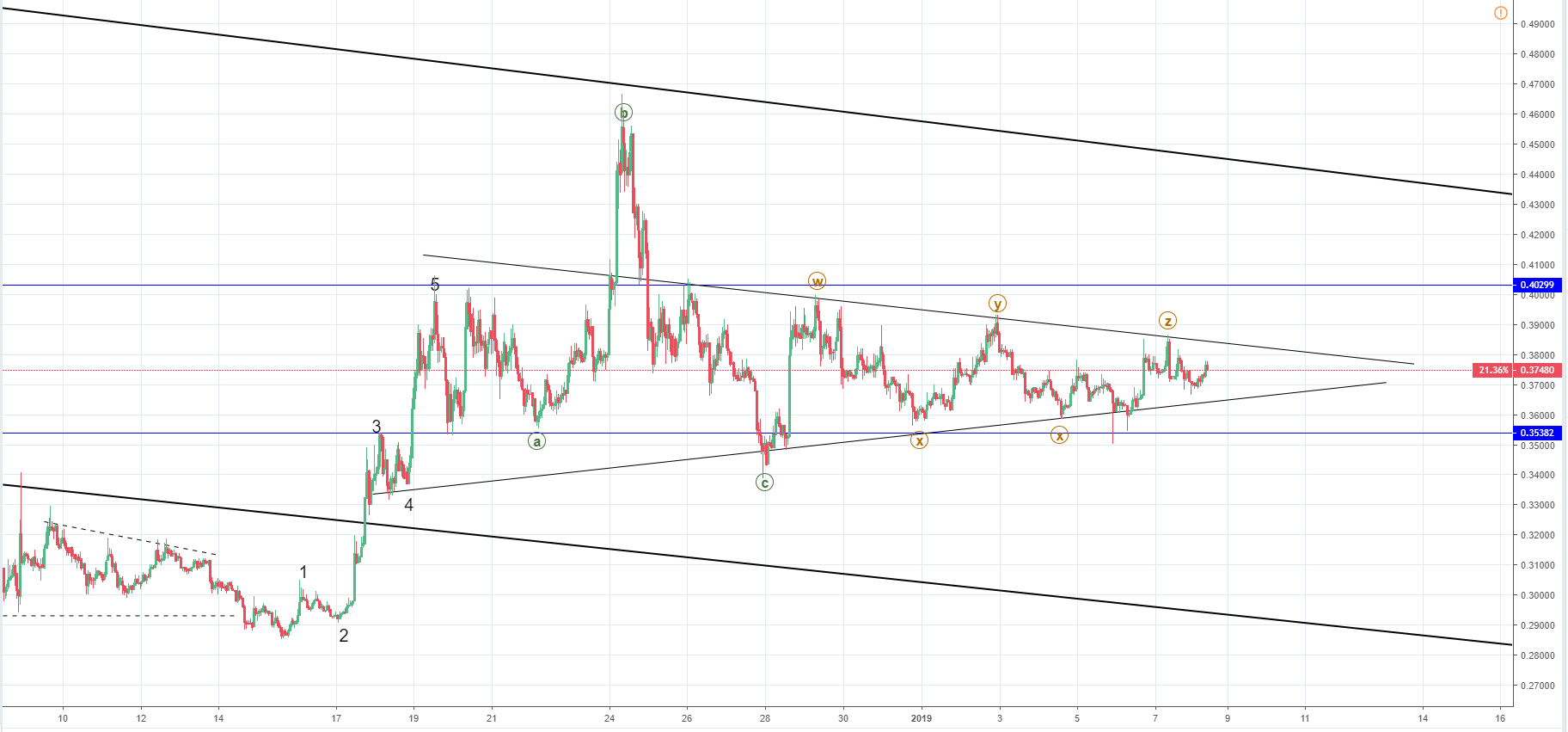 On the hourly chart, the price action has formed a symmetrical triangle and judging by Elliott Wave count we are going to see a breakout from the downside as the current corrective wave ends on the upside. This might not happen straight away since another correction might take place. But even if it did I would expect it to go to the horizontal support level at $0.35382 which is the lower line from the support range the price is currently trading at.