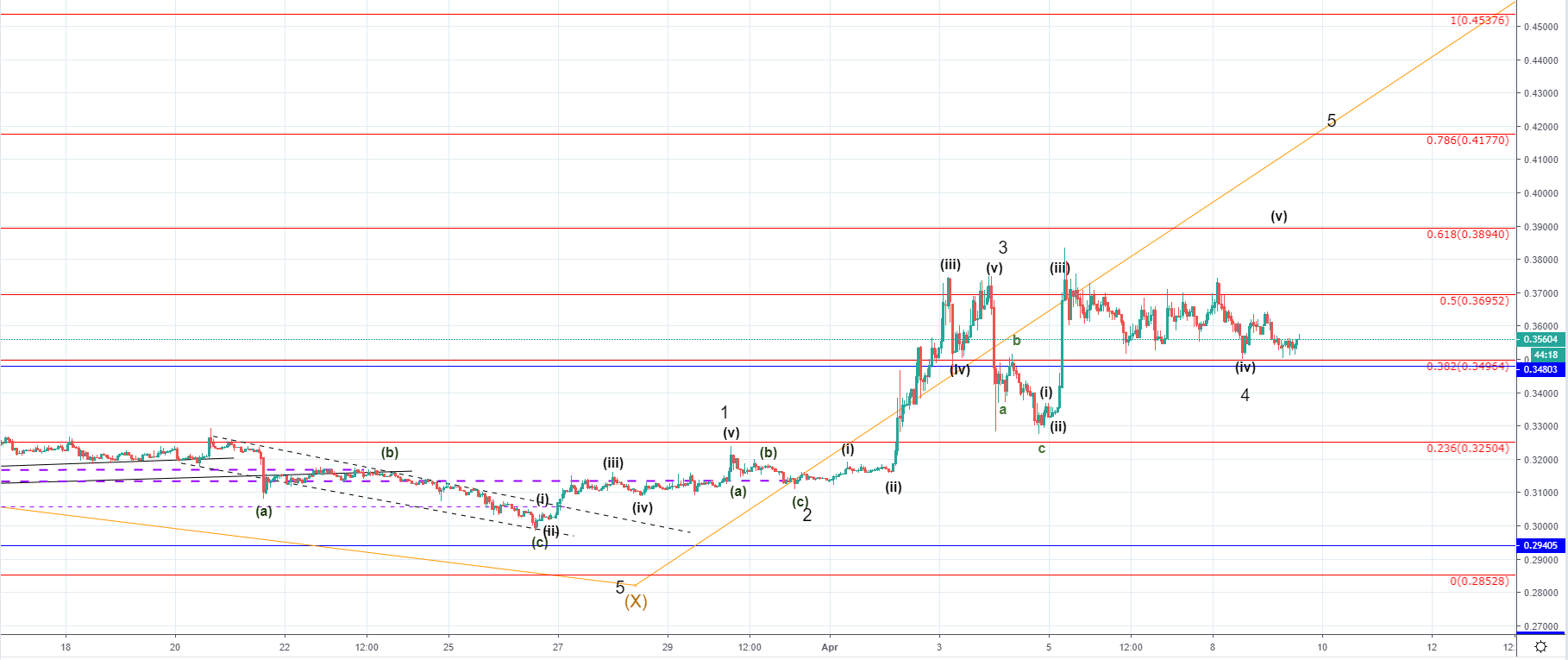 Before the 5th wave should start developing the current correctional structure has to end, and we could see the prolongation with another move to the downside potentially before it starts. The price is set to interact with some of the upper Fibonacci levels for the 5th wave completion so the most optimal level I would be looking for is at the 0.786 or in price terms at $0.4177.