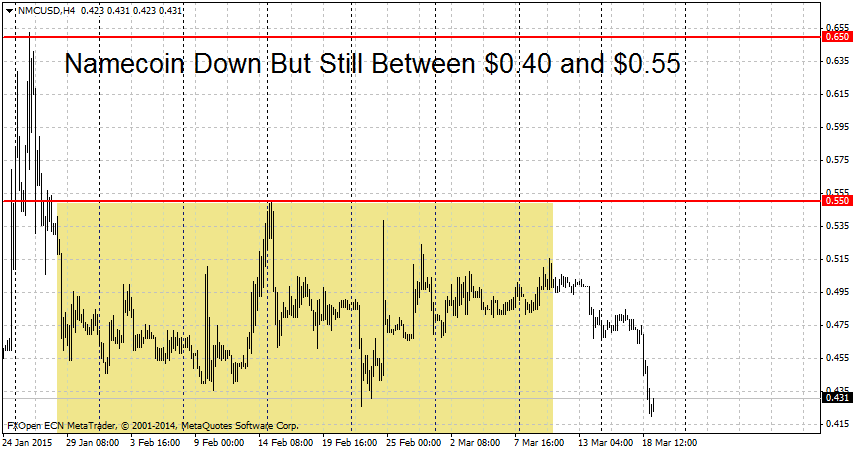 While NMC/USD failed to rally substantially along with bitcoin, it had no problem following bitcoin’s 10% decline yesterday by losing a comparable 9.1 percent. Namecoin continued the losses today as well, falling to a new multi-day low of 42 cents before retracing somewhat.