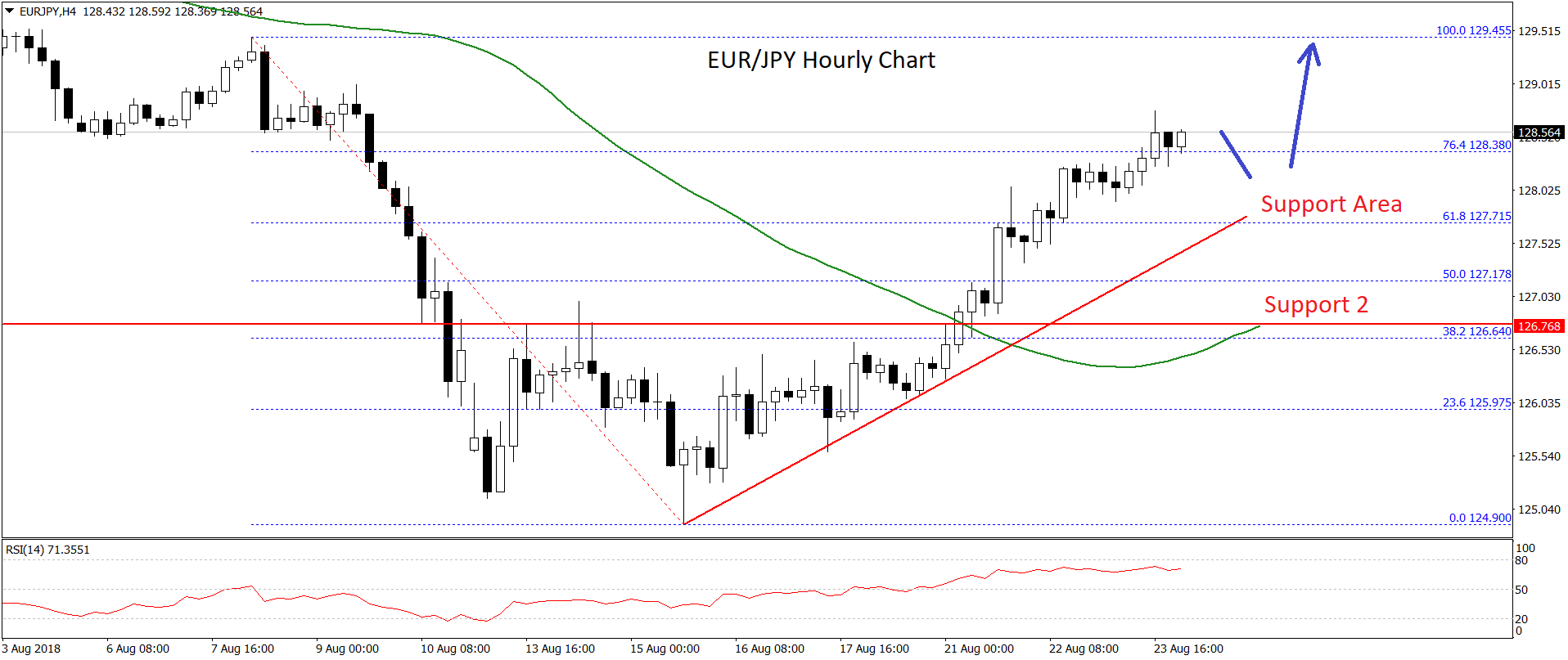 Below the trend line support, the 127.00 level is a decent support area since it coincides with the 50 SMA. Overall, the market sentiment is positive and EUR/JPY is likely to accelerate gains above the 128.50 level in the near term.