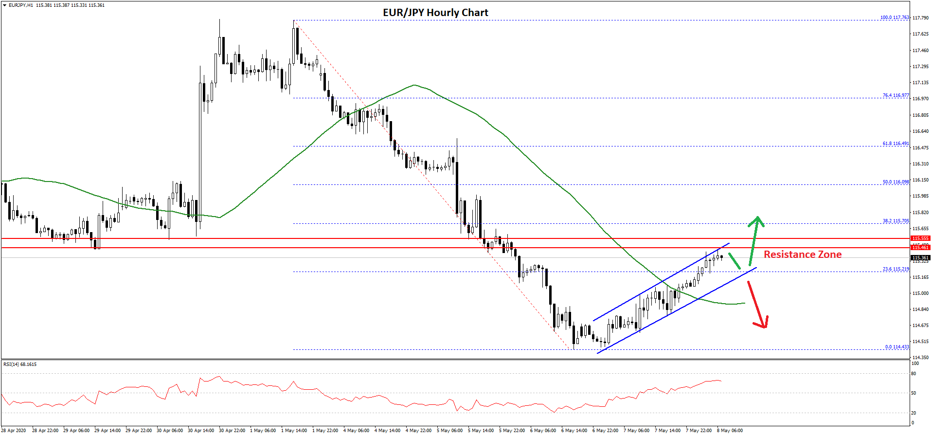 - There is a rising channel forming with resistance near 115.55 on the hourly chart of EUR/JPY.