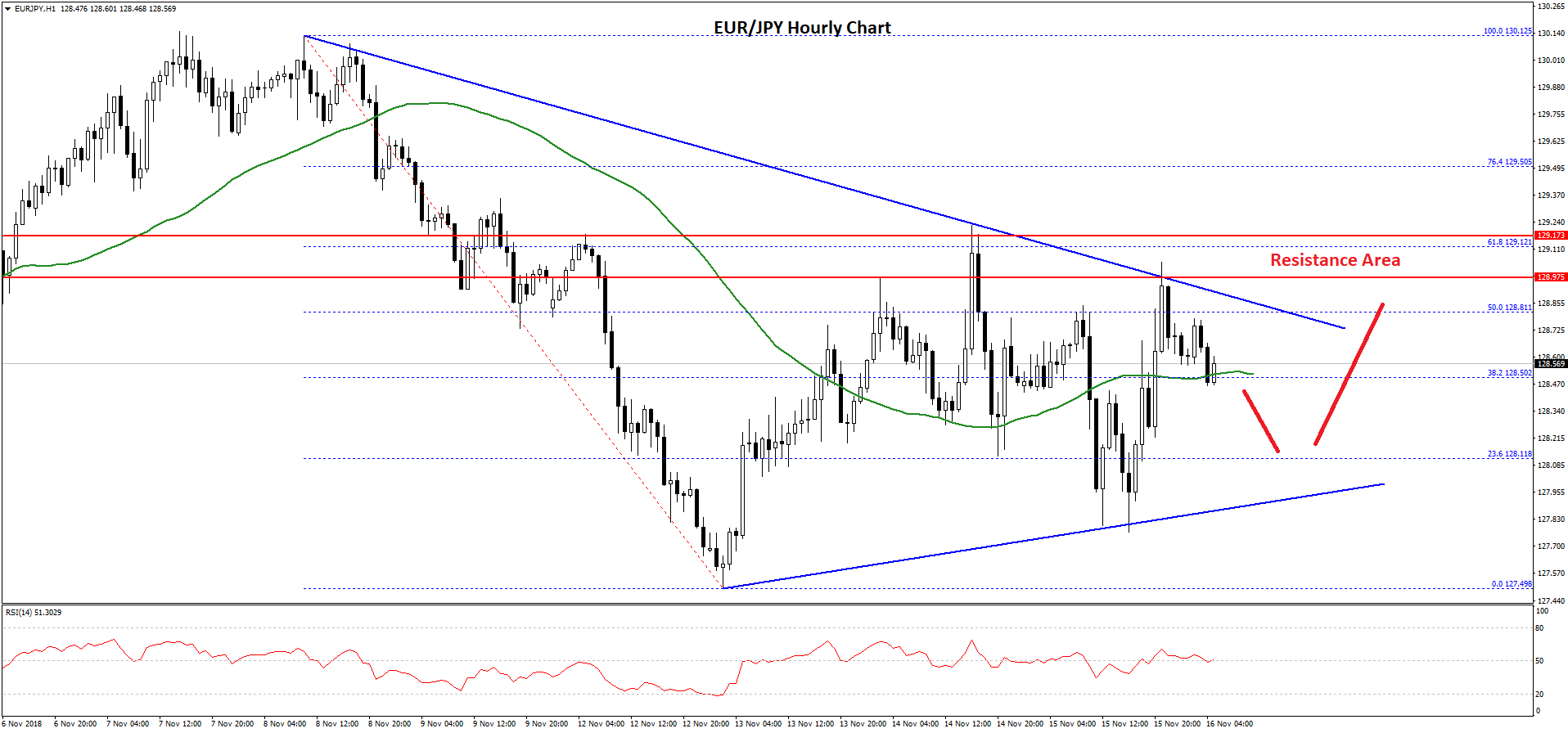 - There is a major bearish trend line formed with resistance at 128.80 on the hourly chart of EUR/JPY.