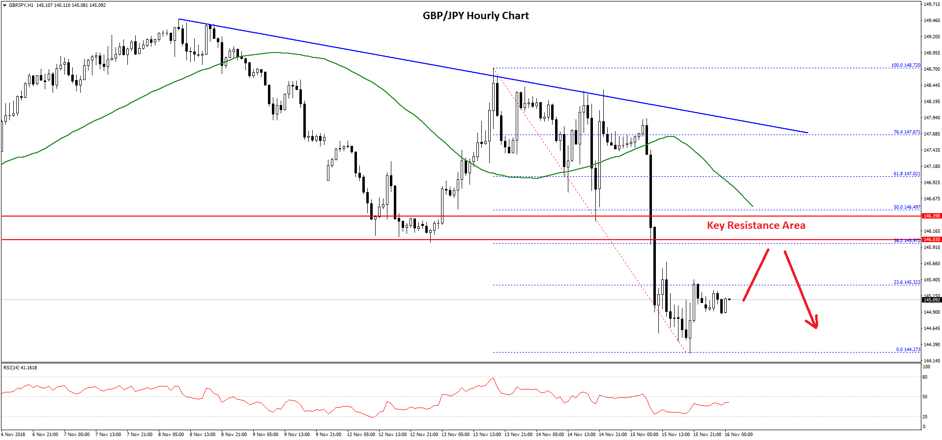 The decline was such that the pair also traded below the 145.00 support and settled below the 50 hourly simple moving average. It traded as low as 144.27 and later started a short term recovery. It tested the 23.6% Fib retracement level of the recent decline from the 148.72 high to 144.27 low.