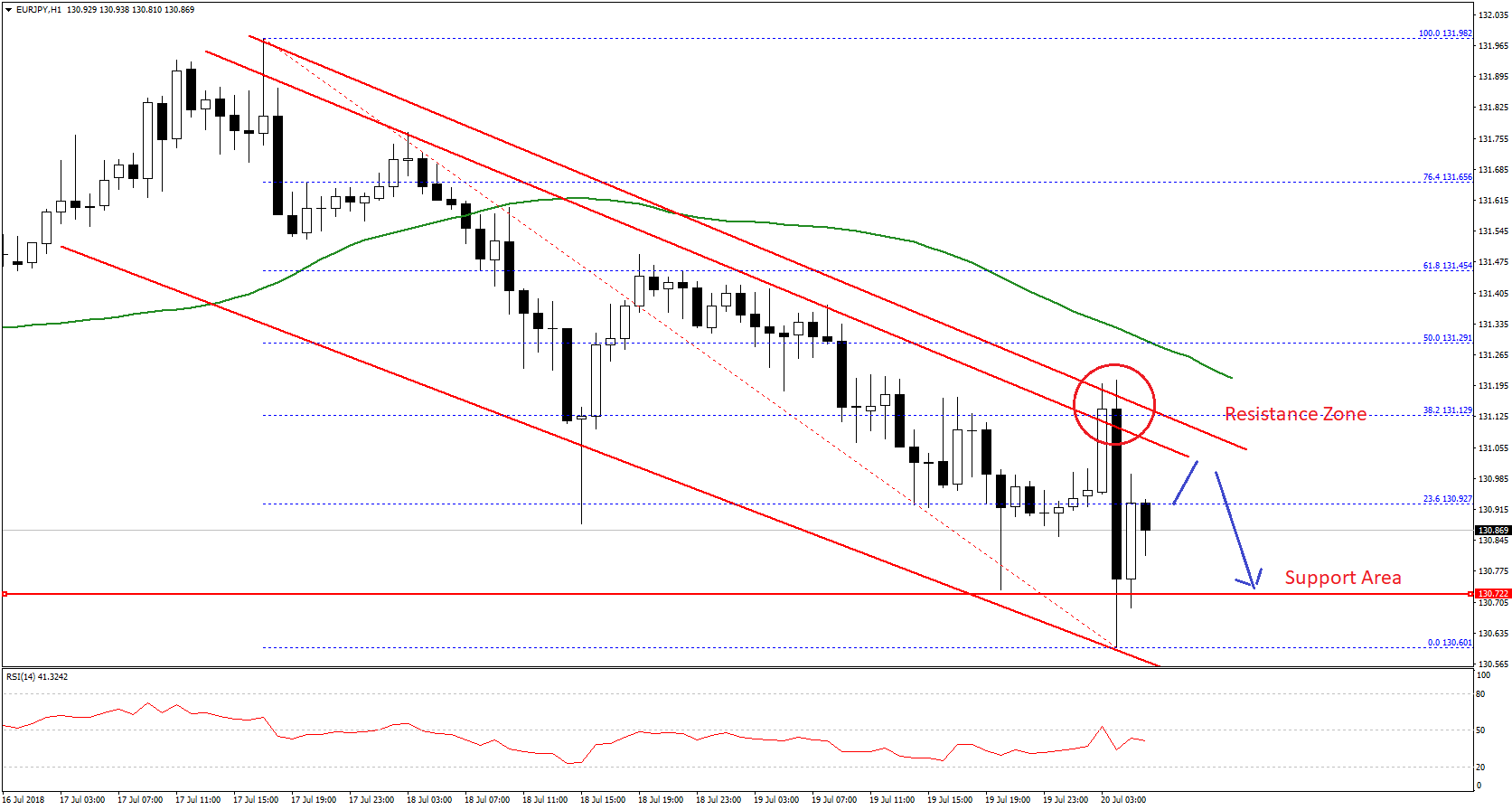 After a decent uptrend, the Euro faced a strong selling interest near the 132.00 level against the Japanese Yen. The EUR/JPY pair started a major downward move and declined below the 131.50, 131.20 and 131.00 support levels.