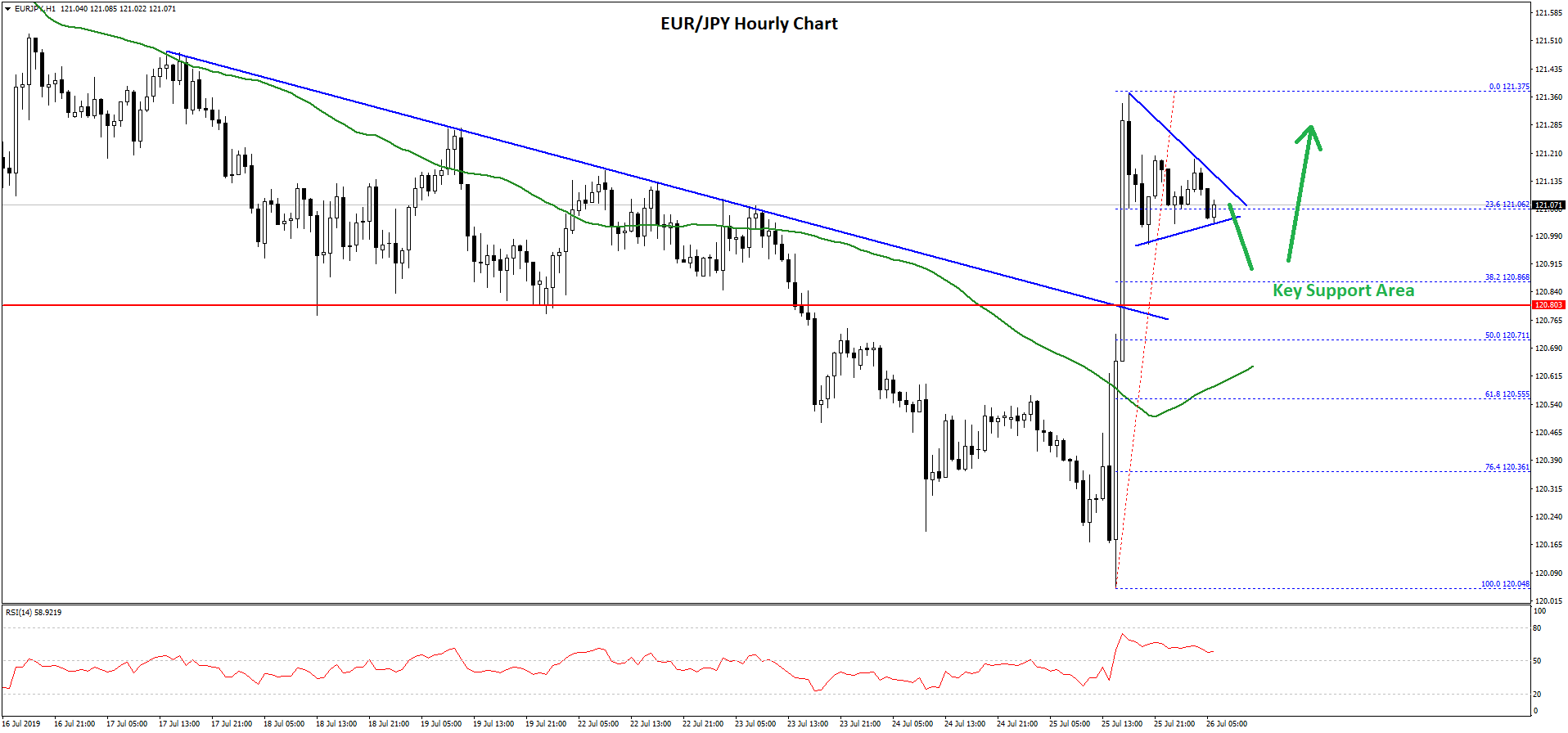 - There was a break above a major bearish trend line with resistance near 120.80 on the hourly chart of EUR/JPY.