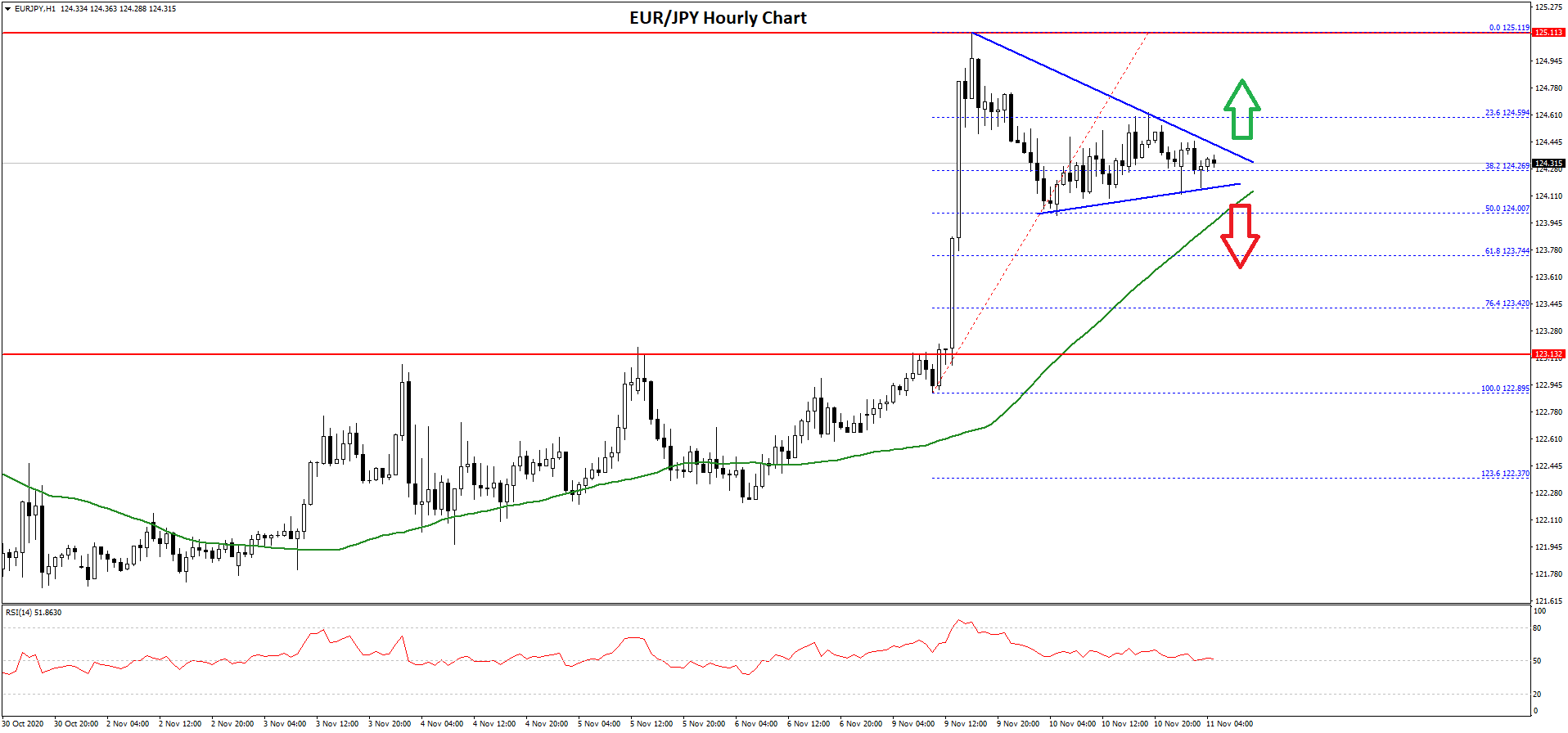 There was also a break above the 124.50 level and the 50 hourly simple moving average. Finally, there was a spike above the 125.00 level. A high is formed near 125.11 and the pair is currently correcting lower.