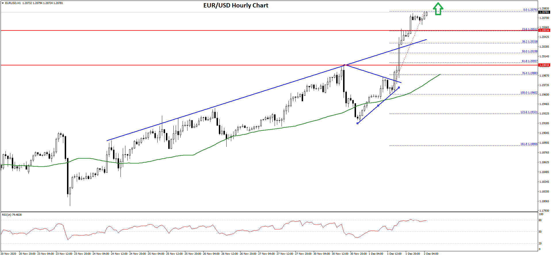 The pair even gained strength above 1.2020 and settled above the 50 hourly simple moving average. Moreover, there was a break above a key connecting resistance trend line at 1.2030 on the hourly chart of EUR/USD.