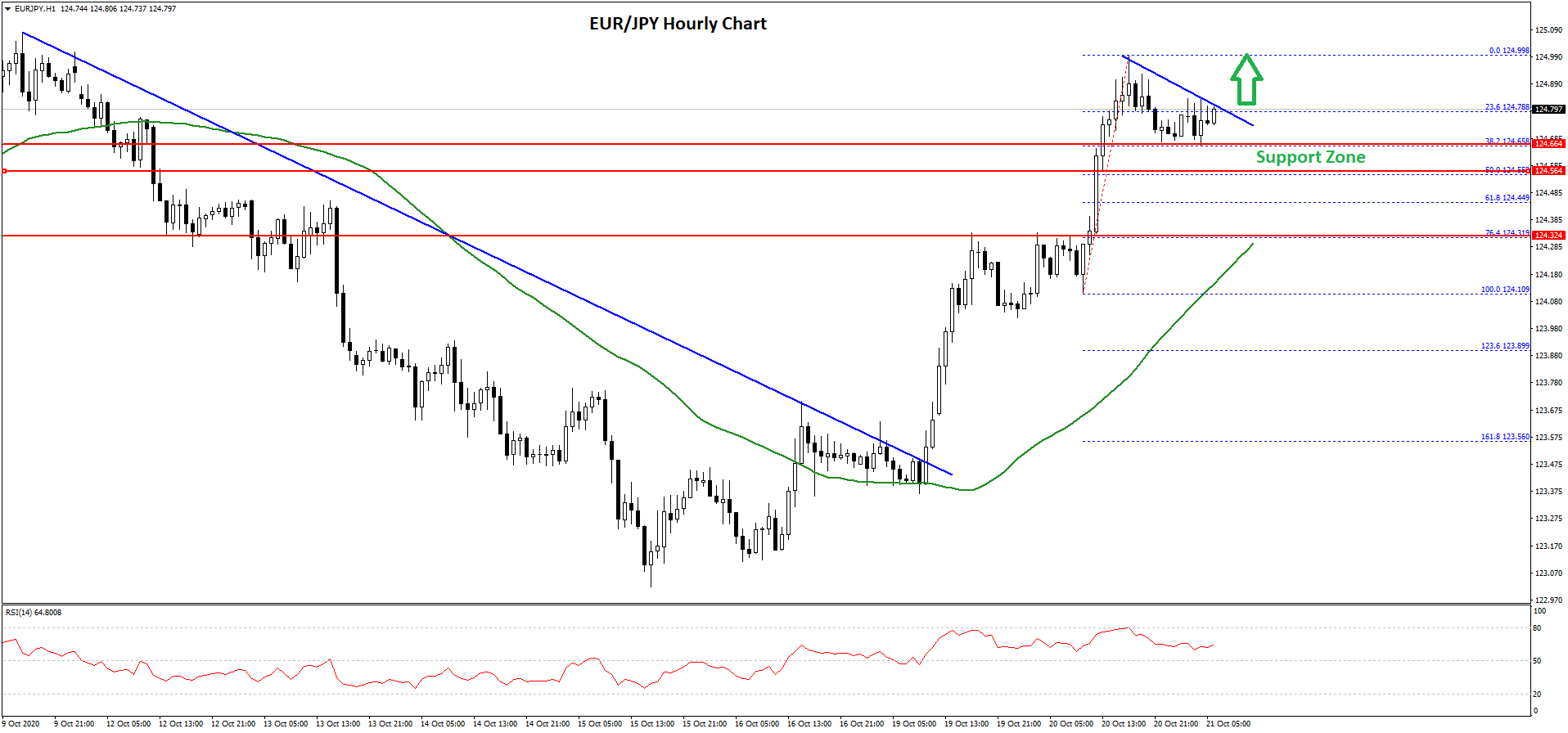 Any further losses may perhaps lead the pair towards the 124.30 support level and the 50 hourly simple moving average. The next key support is at 124.00. On the upside, the EUR/JPY pair is likely to face hurdles near 124.75 and a connecting bearish trend line.