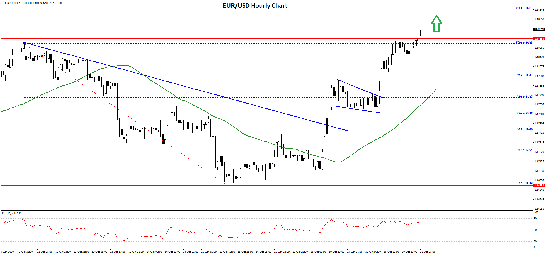 It broke many important hurdles near the 1.1720 and 1.1750 levels to move into a positive zone. Moreover, there was a break above a major bearish trend line with resistance near 1.1750 on the hourly chart of EUR/USD.