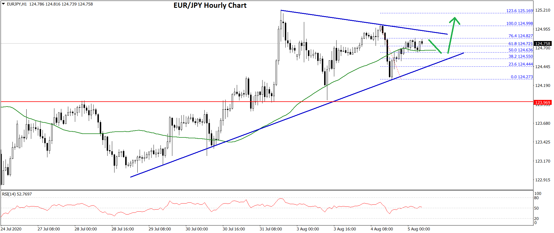 - There is a crucial bullish trend line forming with support near 124.55 on the hourly chart.