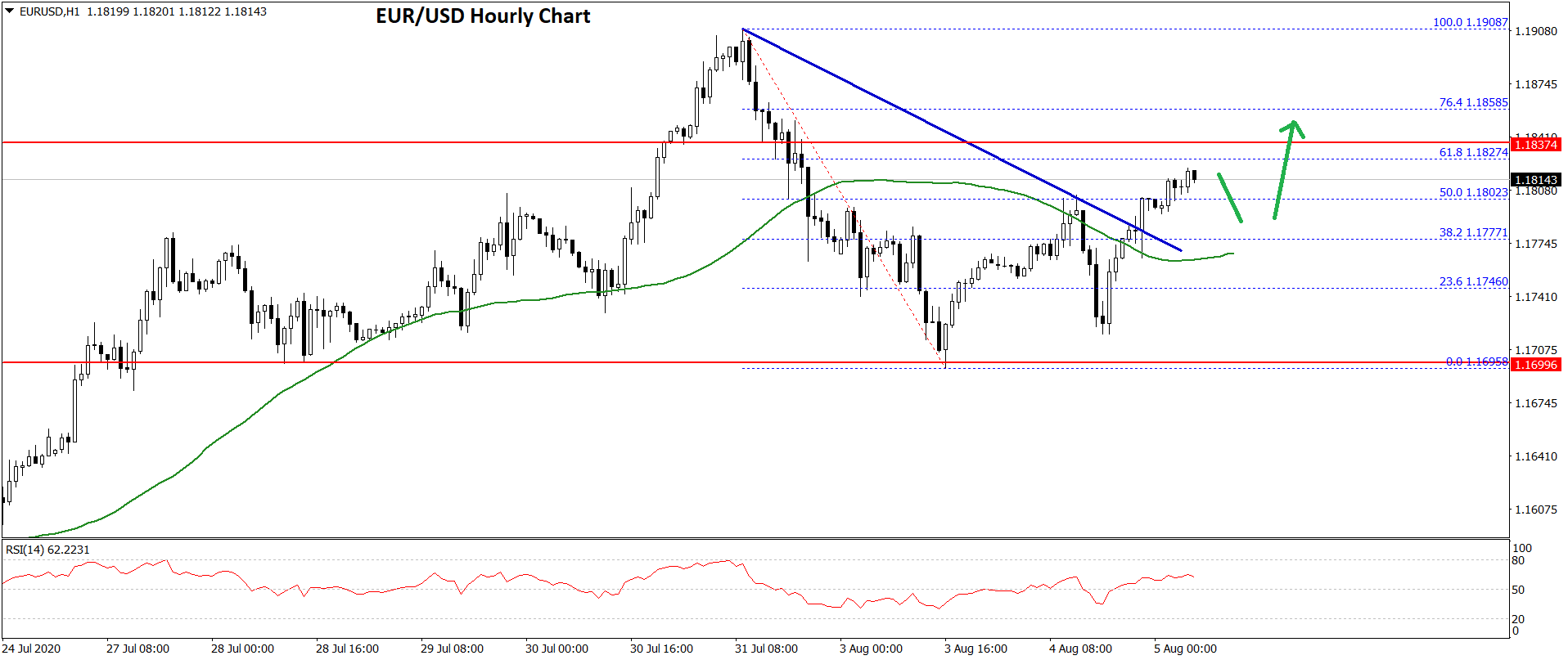 Moreover, there was a break above a major bearish trend line with resistance near 1.1780 on the hourly chart of EUR/USD. The pair is now trading above the 1.1800 level. An initial resistance is seen near the 1.1825 level.