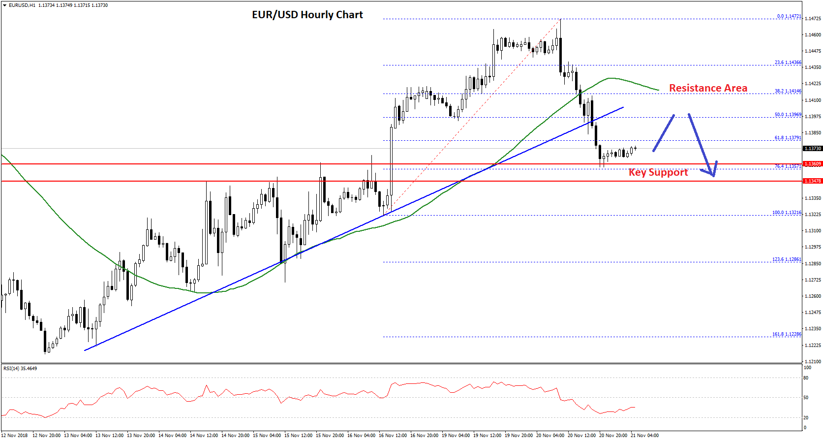- There was a break below a major bullish trend line with support at 1.1395 on the hourly chart of EUR/USD.