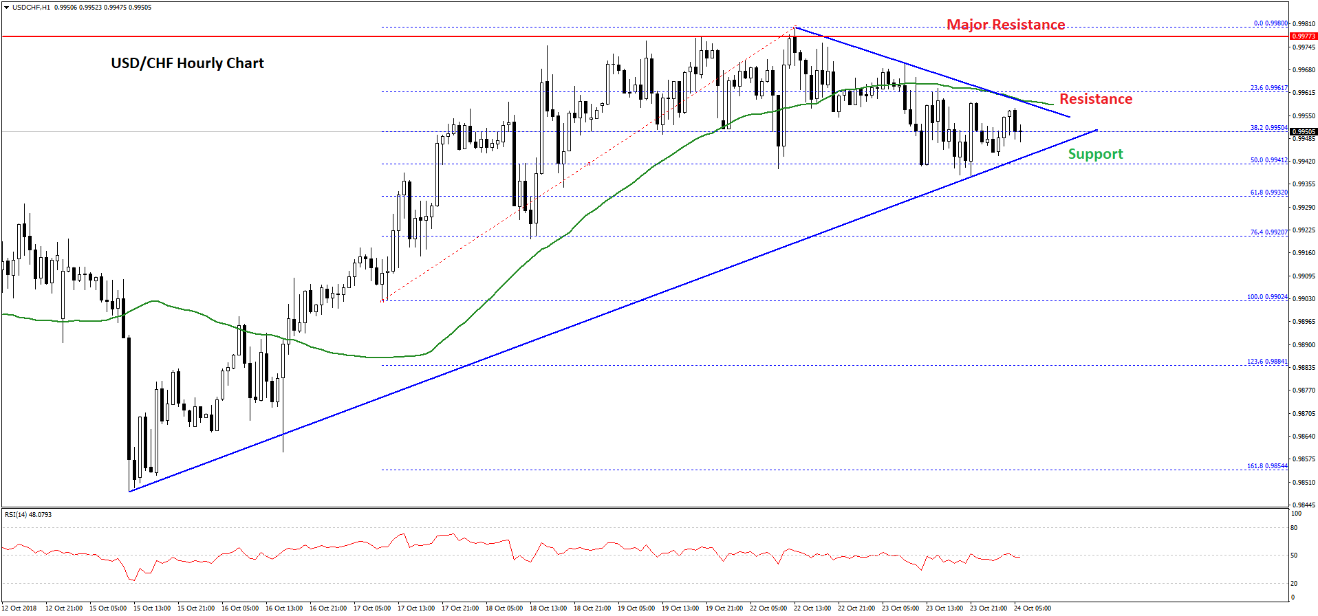 EUR/USD declined recently and broke the 1.1500 support area. USD/CHF seems to be forming a major top near the 0.9980 resistance area.