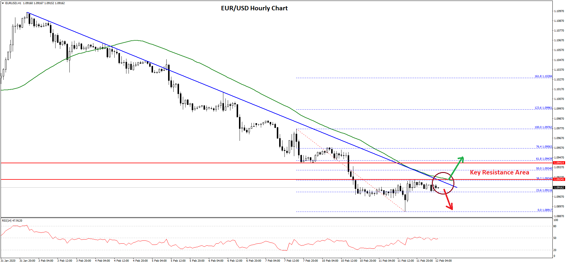 - There is a major bearish trend line forming with resistance near 1.0925 on the hourly chart of EUR/USD.
