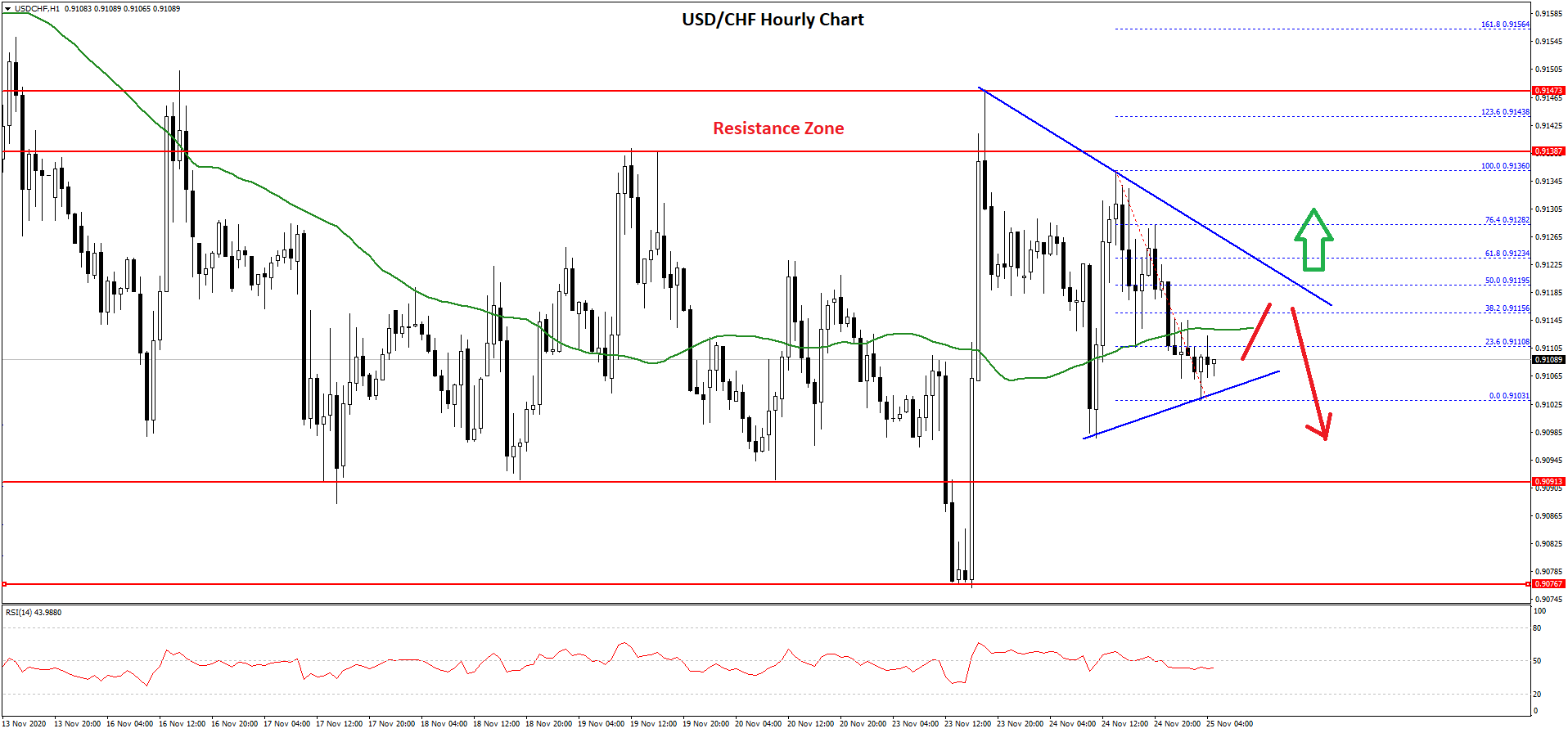 The US Dollar made a few attempts to clear 0.9145 and 0.9150 resistance levels against the Swiss franc, but it failed. The USD/CHF pair traded as high as 0.9136 recently before declining.