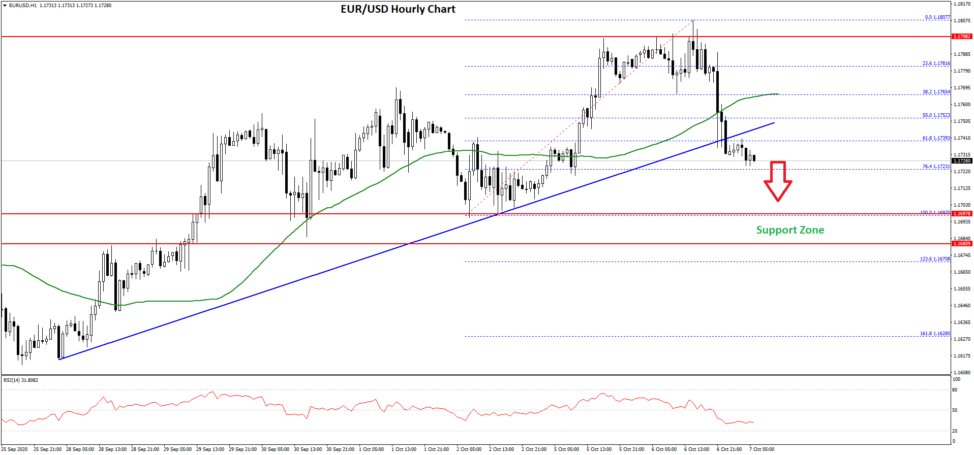 The pair even broke the 50% Fib retracement level of the upward move from the 1.1697 swing low to 1.1807 high. More importantly, there was a break below a major bullish trend line with support near 1.1740 on the hourly chart of EUR/USD.