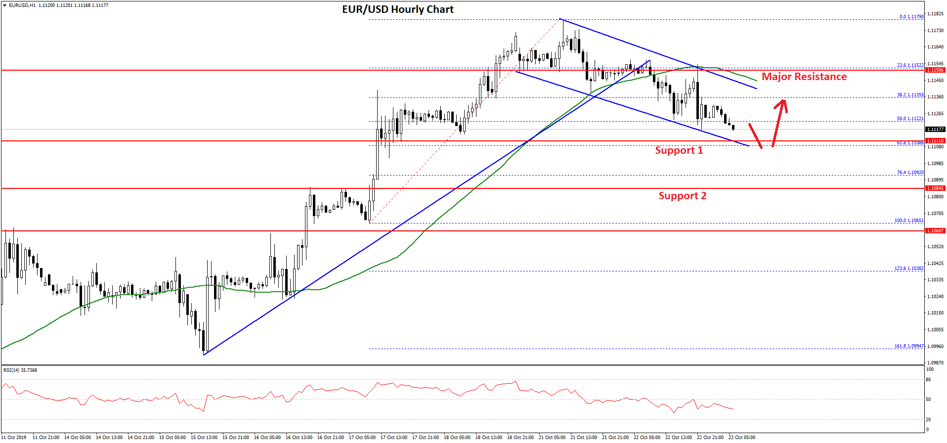 Moreover, there was a break below a major bullish trend line with support near 1.1152 on the hourly chart of EUR/USD. The pair is now trading well below the 1.1140 level and the 50 hourly SMA.