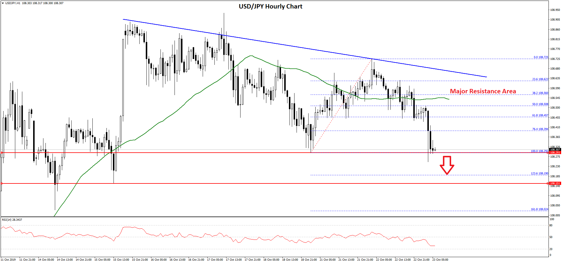 Moreover, there was a close below the 108.50 support and the 50 hourly simple moving average. The pair even traded below the 76.4% Fib retracement level of the upward move from the 108.29 low to 108.72 high.