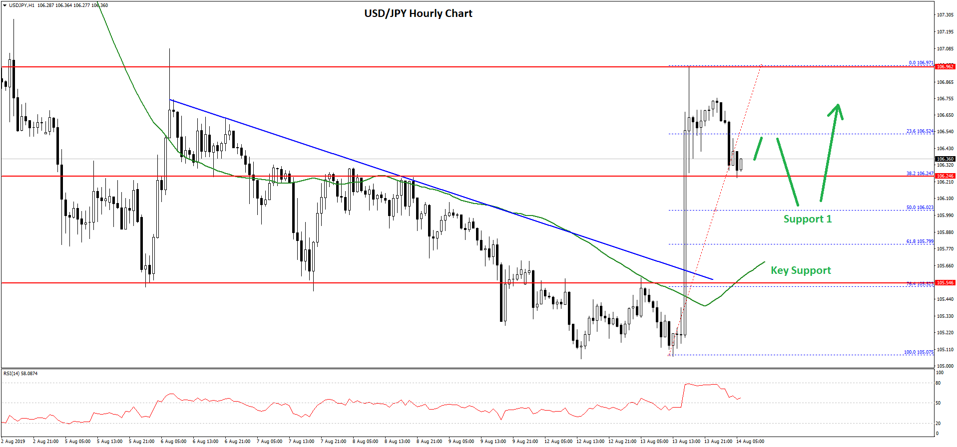 The pair broke the 105.50 and 105.80 resistance levels to move into a positive zone. Moreover, the pair broke a major bearish trend line near 105.65 on the hourly chart.