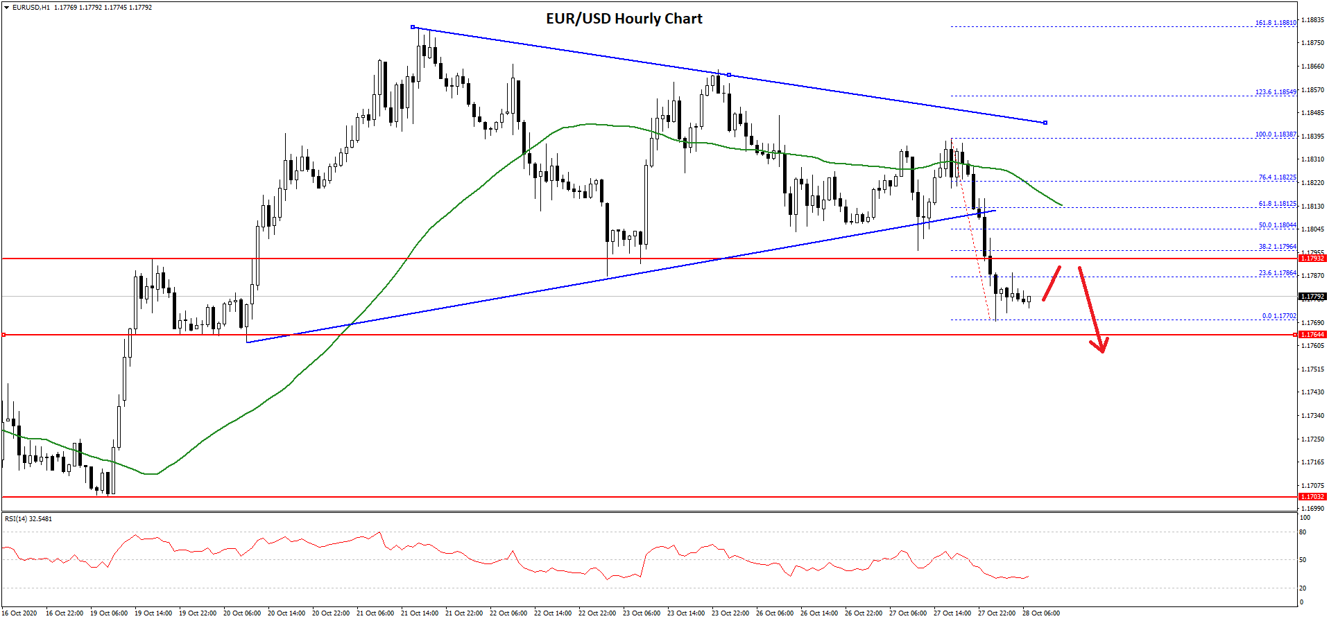 The pair even broke the 1.1820 support and settled below the 50 hourly simple moving average. More importantly, there was a break below a major contracting triangle with support near 1.1810 on the hourly chart of EUR/USD.