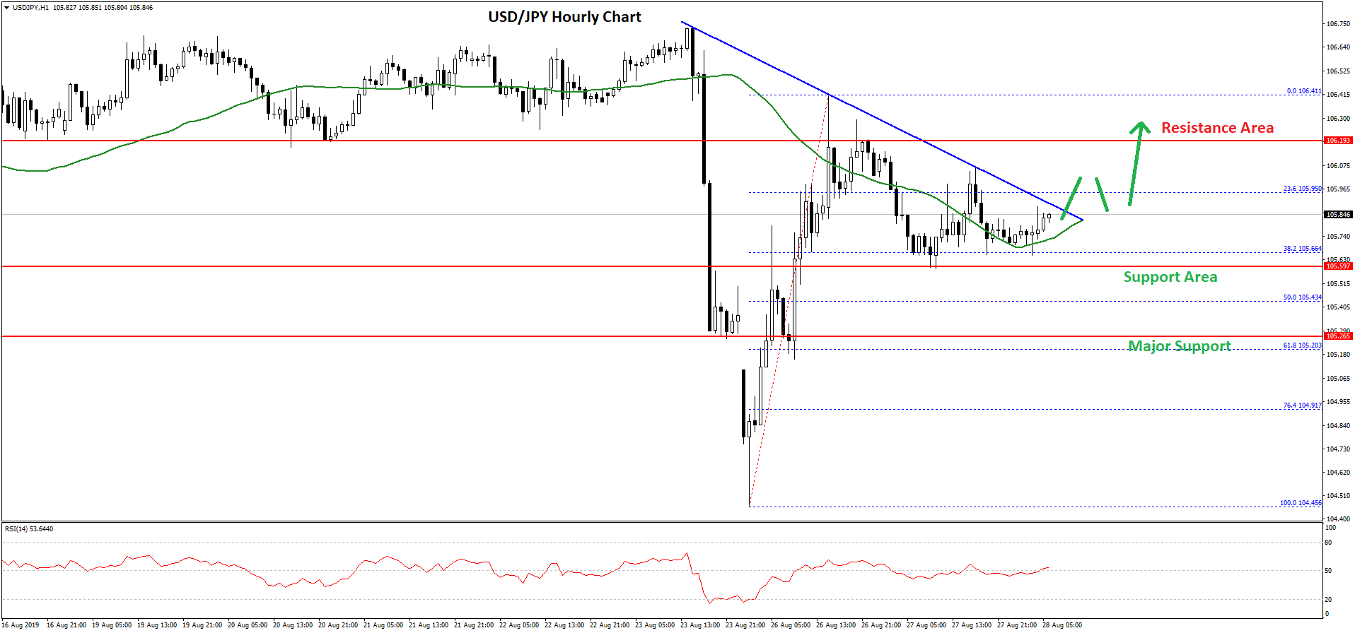 At the moment, the 105.60 level is acting as a support and the pair is showing positive signs. On the upside, there is a key bearish trend line forming with resistance near 105.90 on the hourly chart.