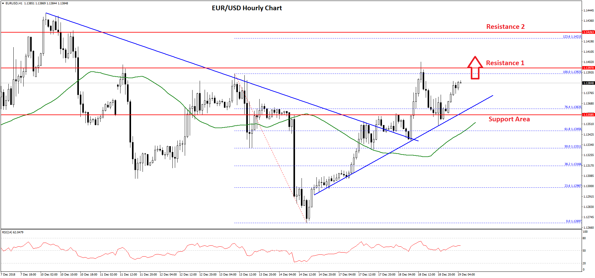 - There was a break above a key bearish trend line with resistance at 1.1352 on the hourly chart of EUR/USD.