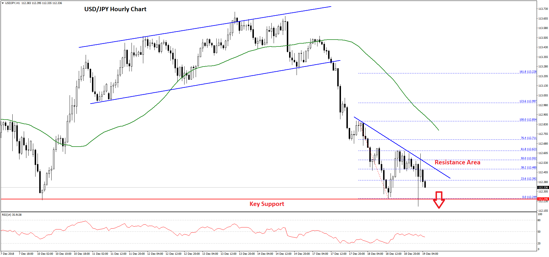 Later, there was a downside break and the pair broke the 113.50 support and the 50 hourly simple moving average. Moreover, there was a break below an ascending channel with support at 113.35 on the hourly chart.