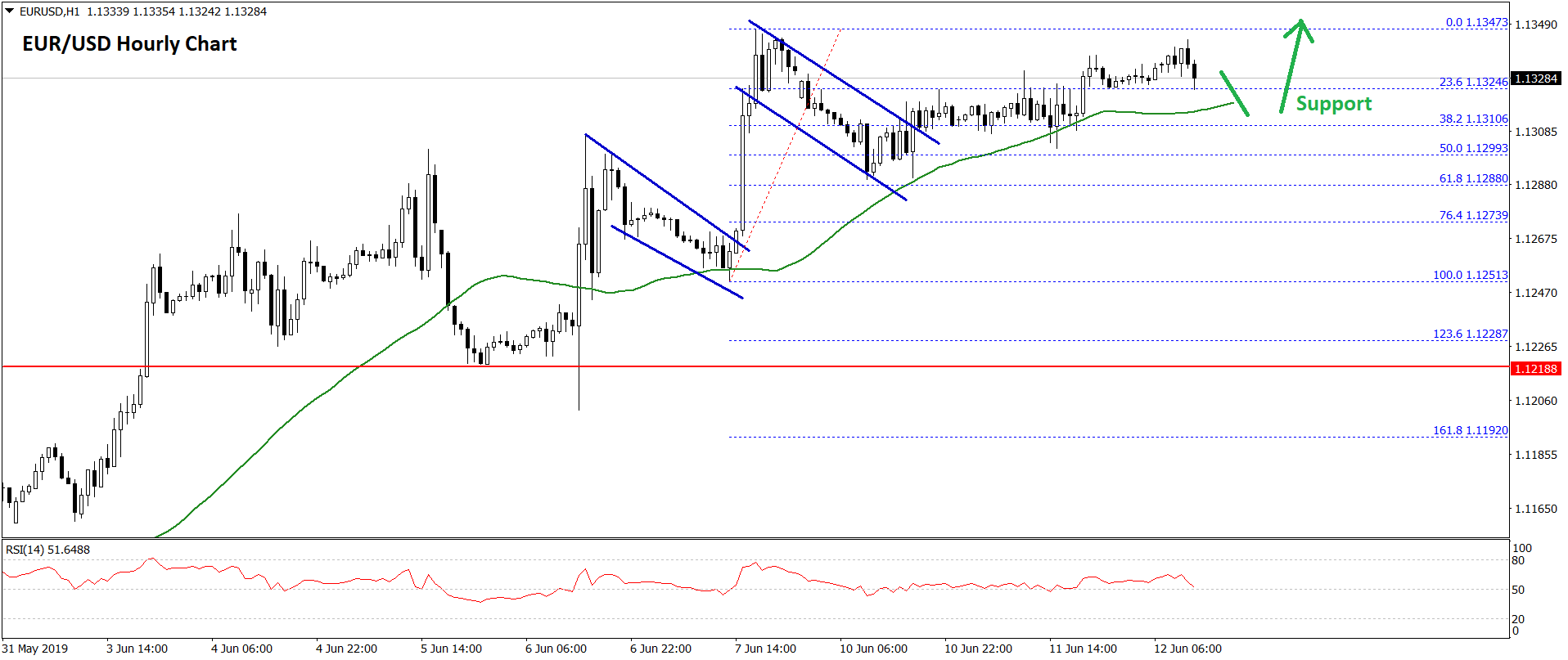 The recent gains were positive, with a close above the 1.1300 level and the 50 hourly simple moving average. During the rise, there was a break above a couple of bullish patterns near 1.1255 and 1.1310 on the hourly chart of EUR/USD.