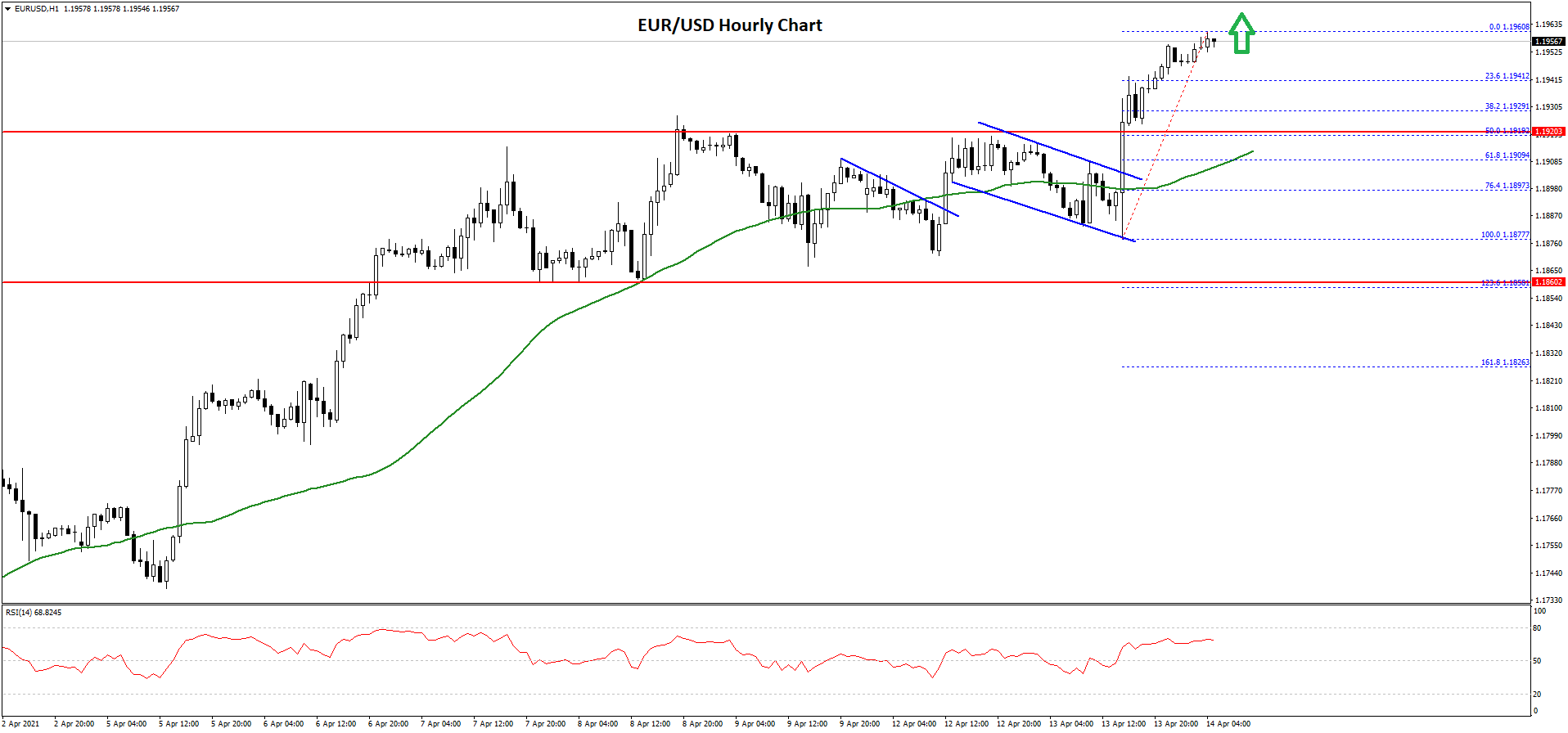It broke a few important hurdles near the 1.1880 and 1.1900 levels. There was also a break above a key declining channel with resistance near 1.1915 on the hourly chart of EUR/USD. The pair gained pace above the 1.1940 level and settled above the 50 hourly simple moving average.