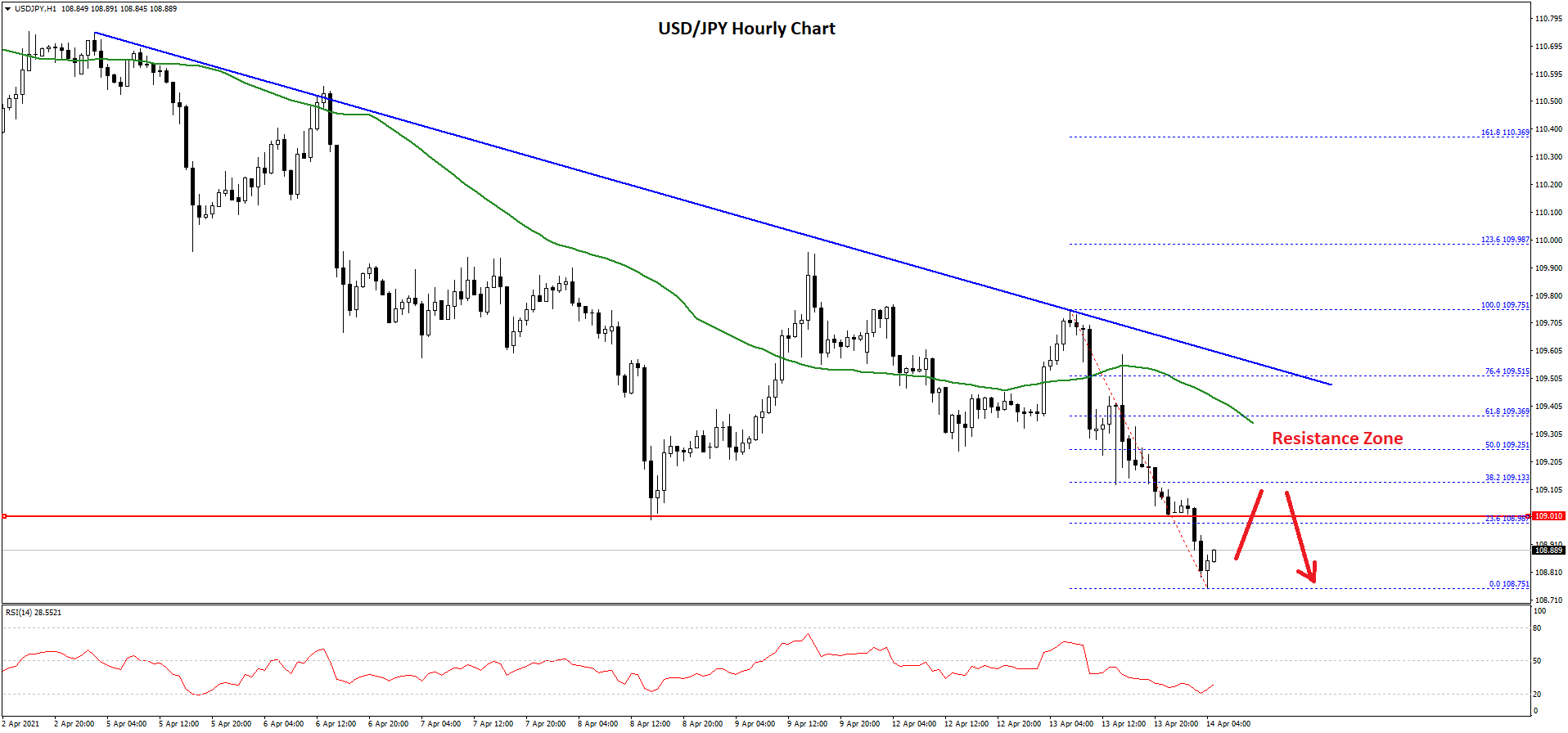 There was also a break below the 109.20 support level. The pair even broke the 109.00 support level and settled below the 50 hourly simple moving average. A low is formed near 108.75 and the pair is now correcting higher.