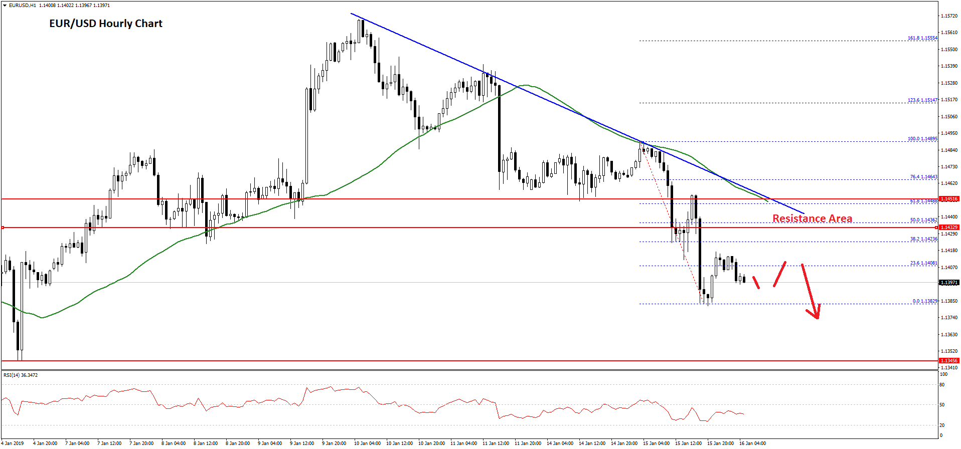 - There is a major bearish trend line formed with resistance at 1.1445 on the hourly chart of EUR/USD.