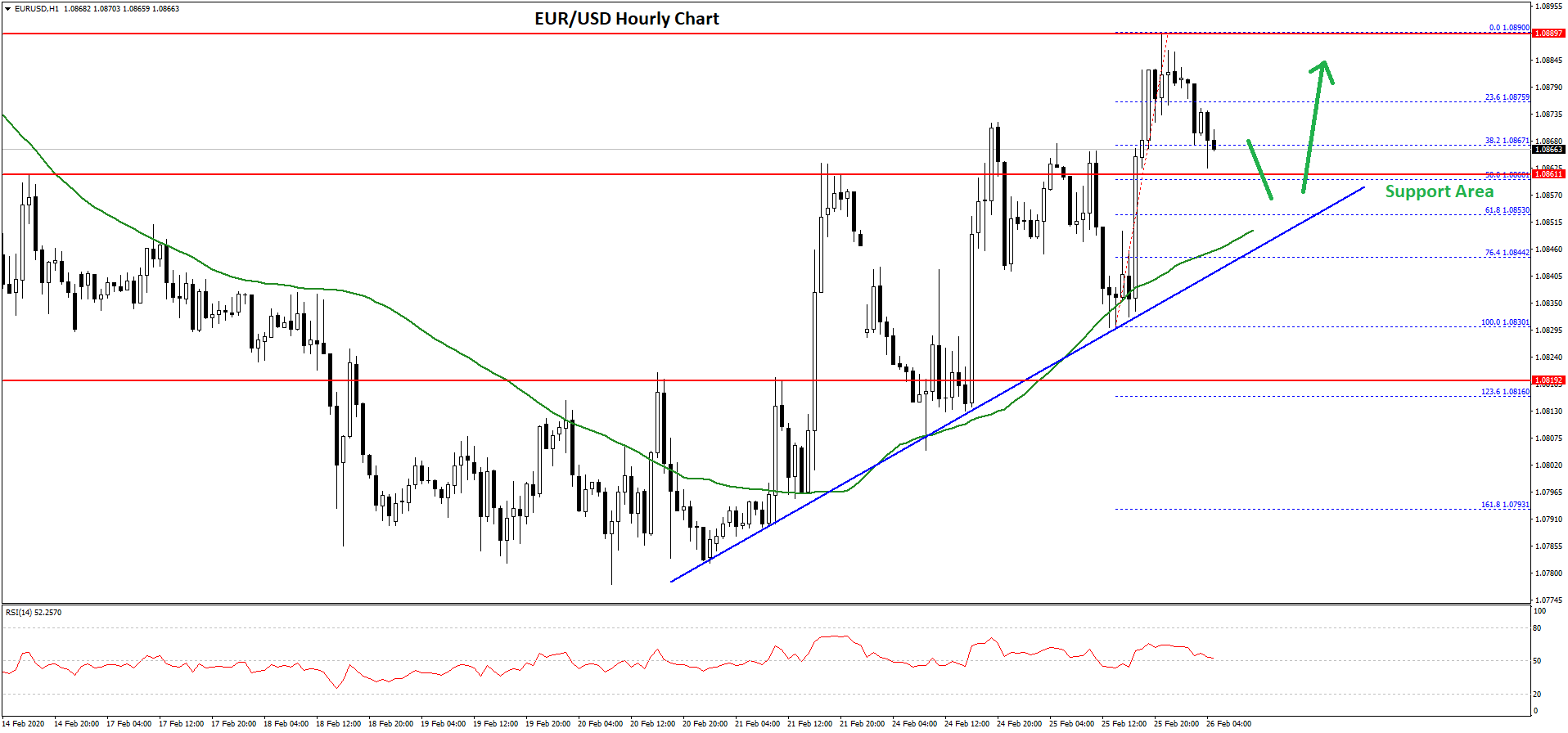 However, there are many supports on the downside, starting with 1.0860. More importantly, there is a key bullish trend line forming with support near 1.0855 on the hourly chart of EUR/USD.