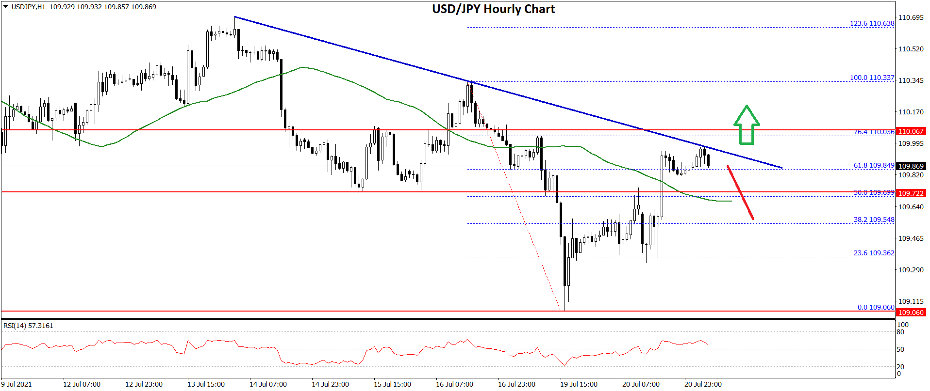 - There is a key bearish trend line forming with resistance near 110.00 on the hourly chart.