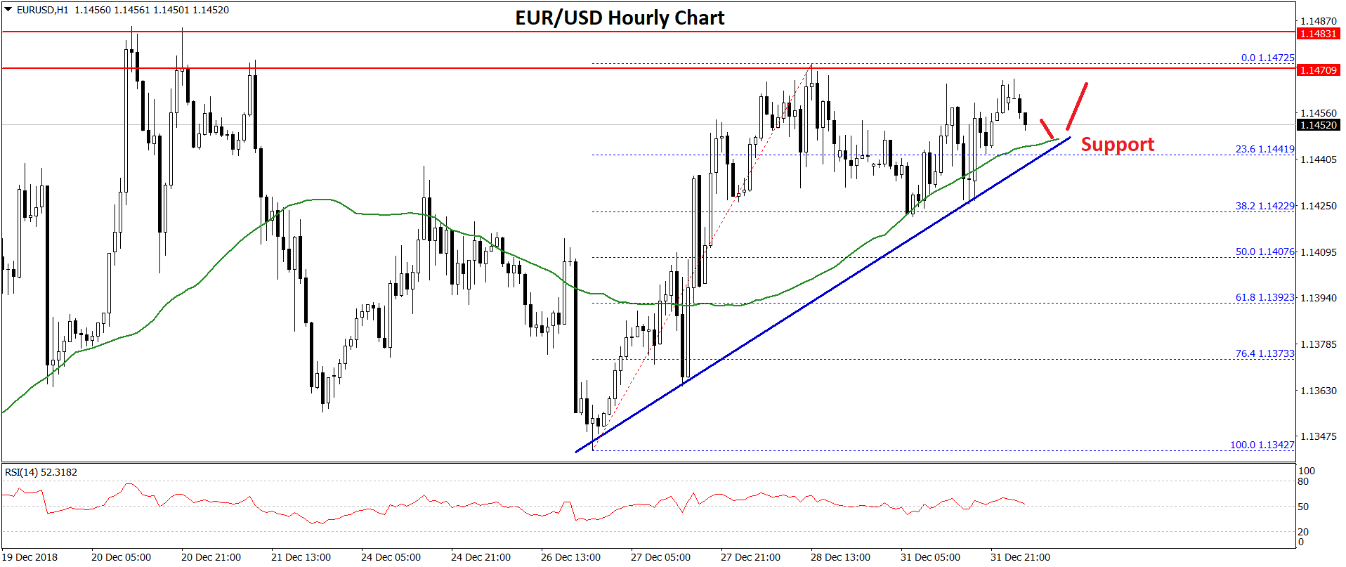More importantly, there is a key bullish trend line formed with support at 1.1440 on the hourly chart of EUR/USD. The 38.2% Fib retracement level of the last wave from the 1.1342 low to 1.1472 high also acted as a solid support.
