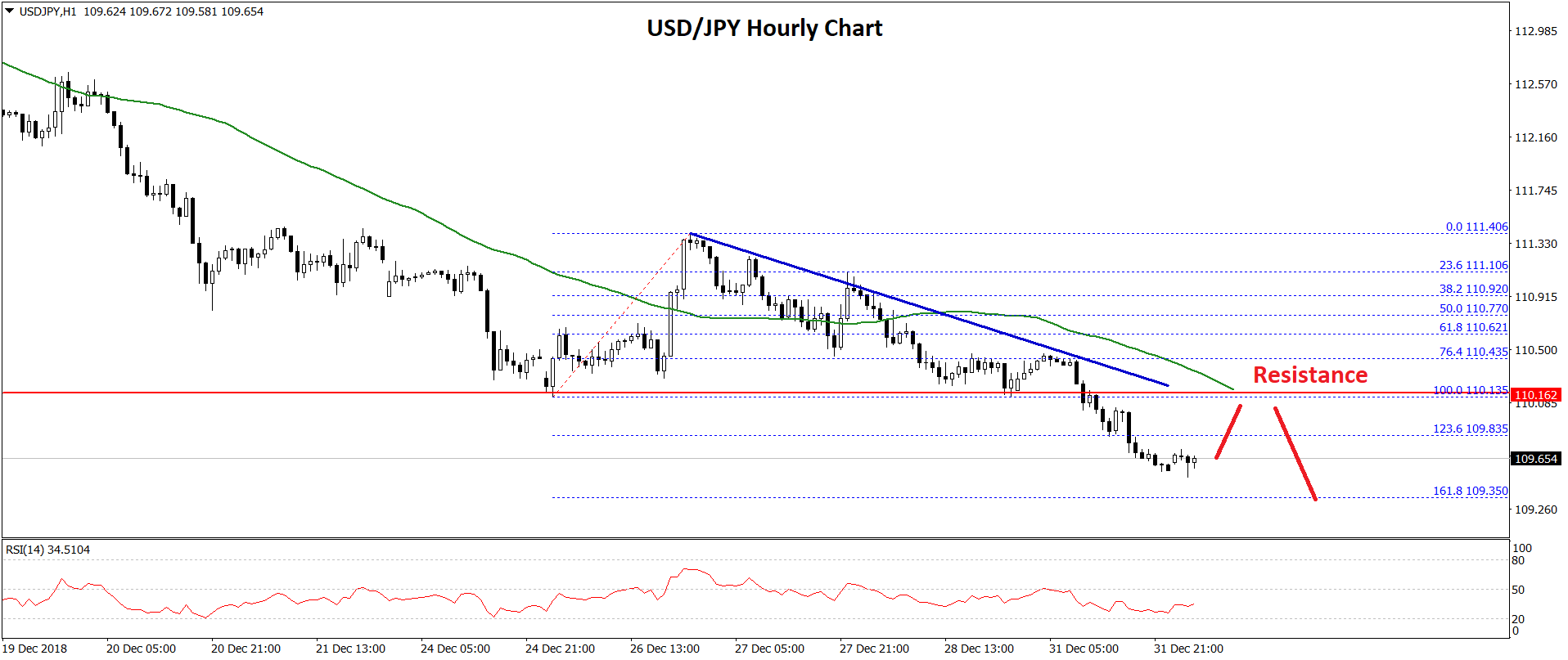 - There is a major bearish trend line formed with resistance at 110.20 on the hourly chart.