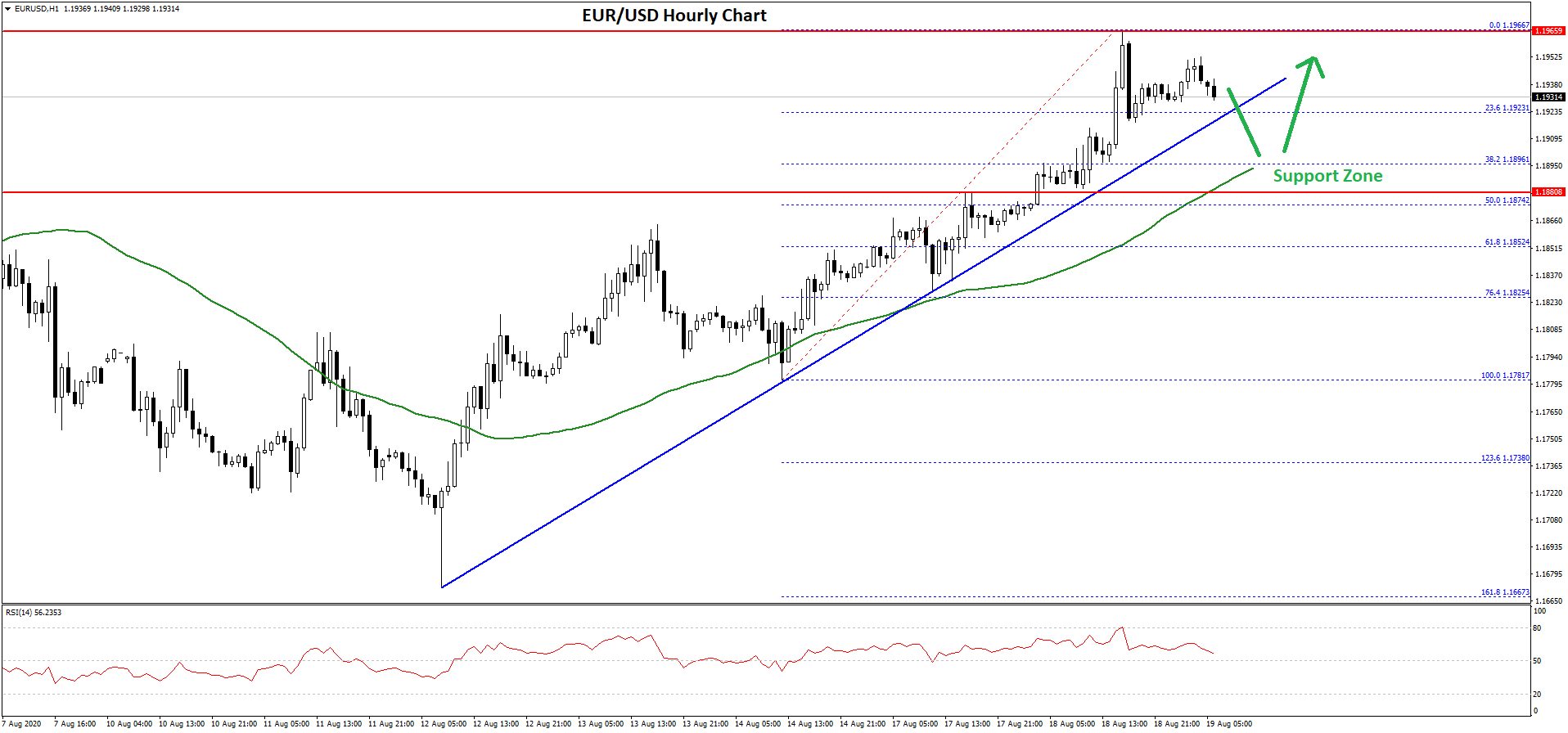 The bulls remained in action and the pair broke the 1.1900 pivot level and the 50 hourly simple moving average. The pair traded as high as 1.1966 on FXOpen and it is currently correcting lower. It is trading below the 1.1950 and 1.1940 levels.