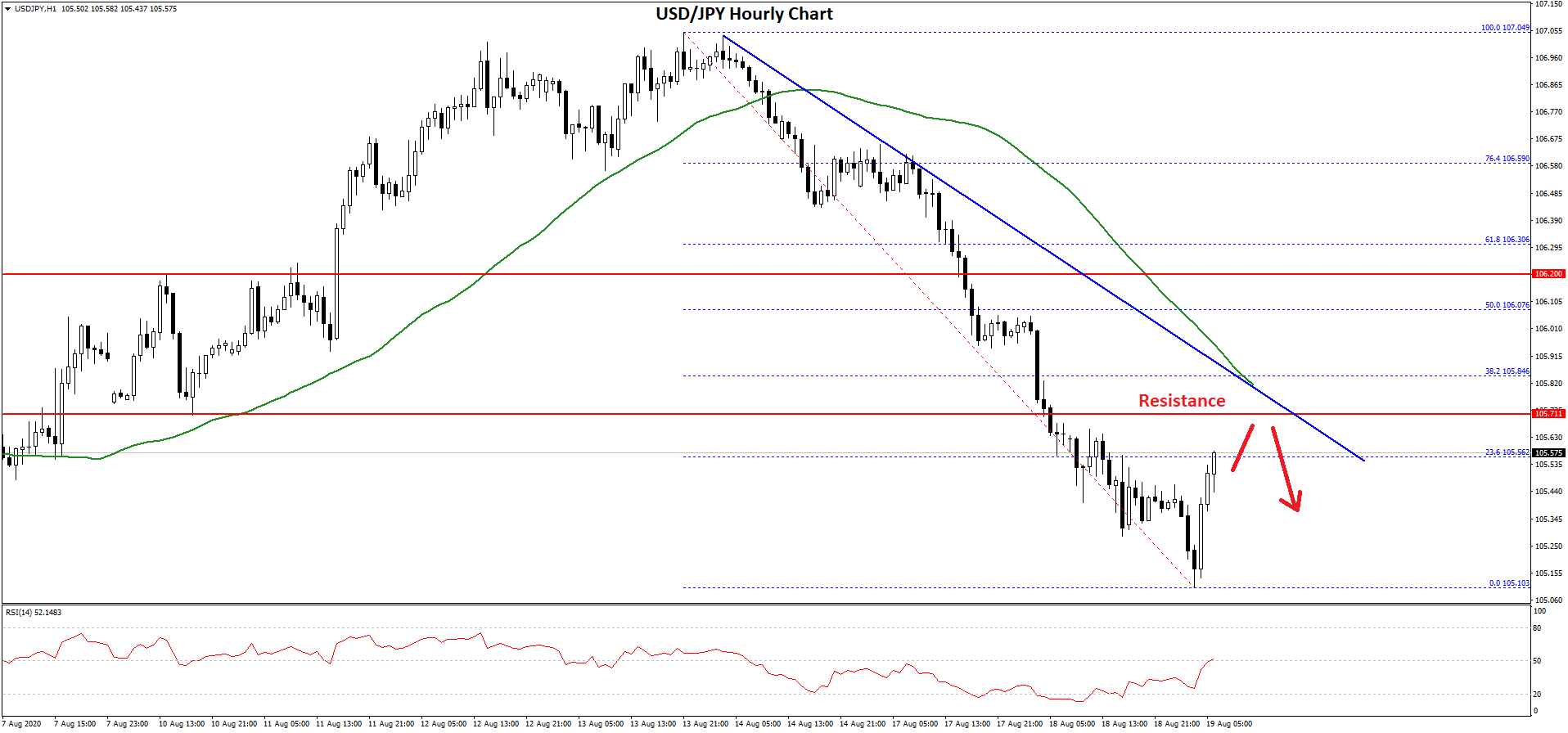 - There is a connecting bearish trend line forming with resistance near 105.75 on the hourly chart.