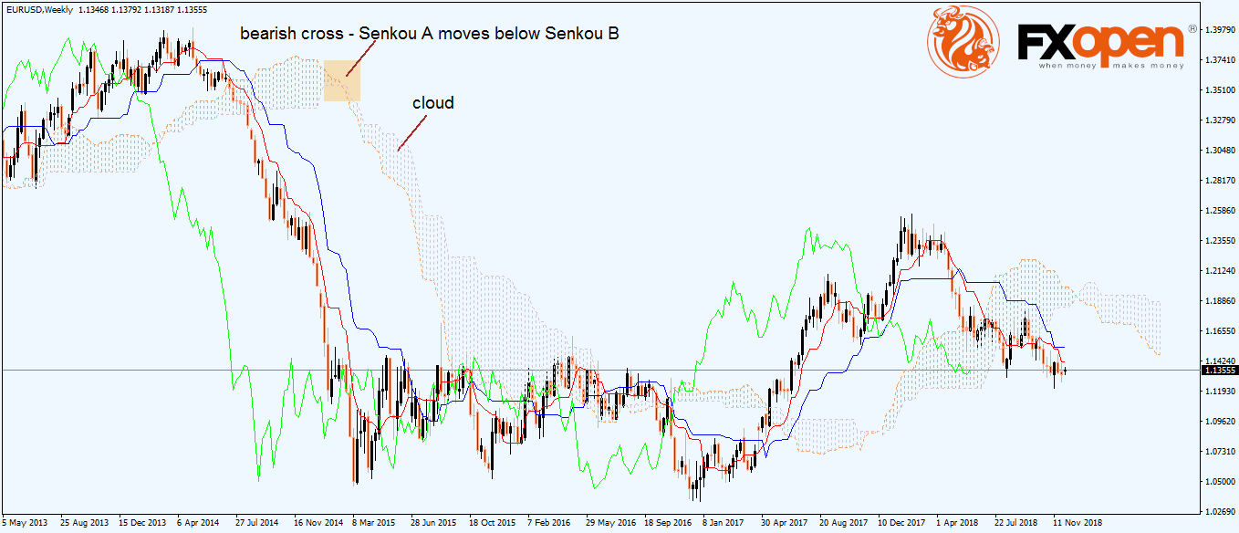 In strong trends, the price always remains below the cloud (in a bearish environment) or above it (in a bullish trend).
