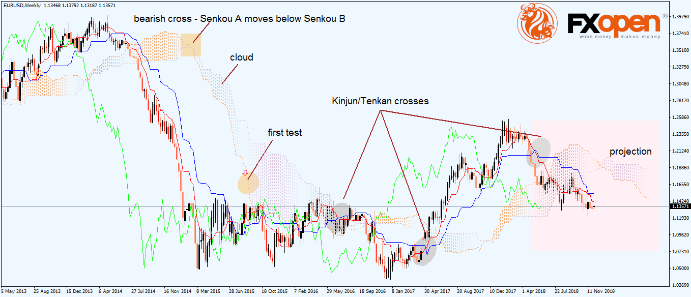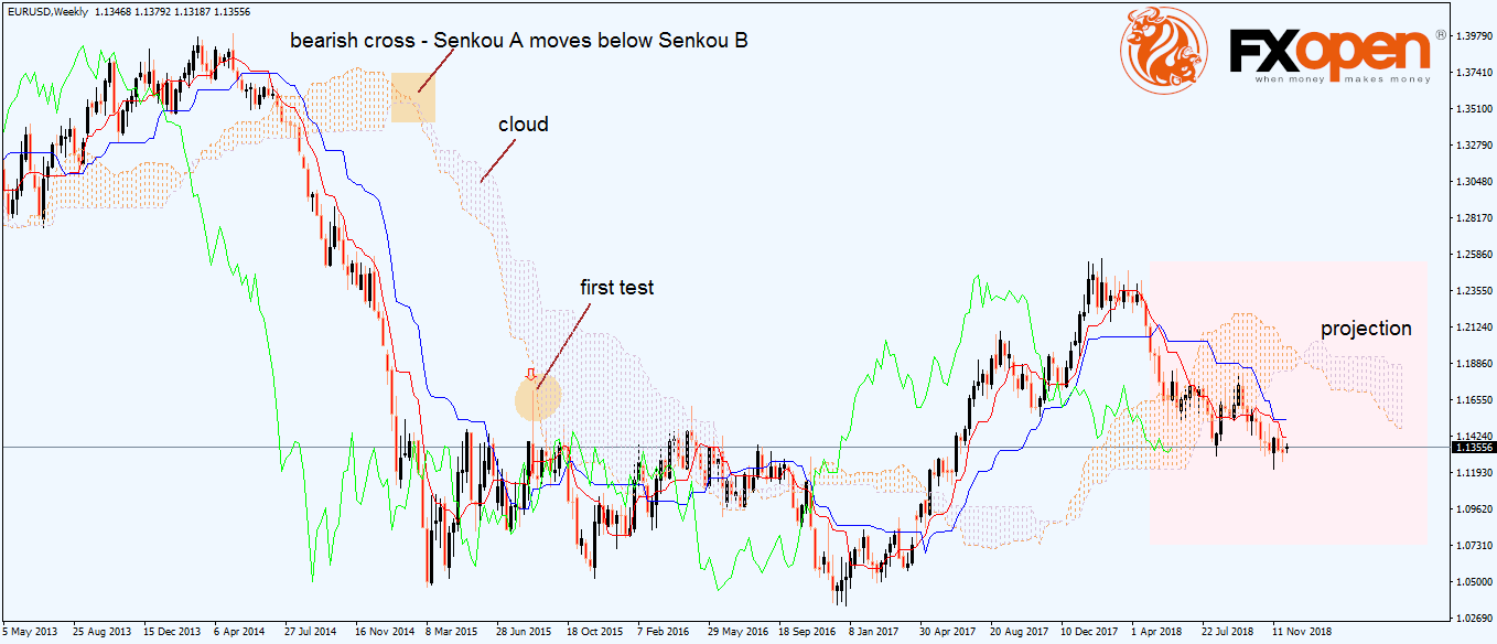 In other words, when doing back-testing with the Ichimoku indicator, one must always consider that for any given candlestick the cloud is projected twenty-six periods on the right side. In this case, the EURUSD weekly timeframe shows the Ichimoku cloud projected twenty-six weeks on the right side, showing potential resistance (as the price currently sits below the cloud).