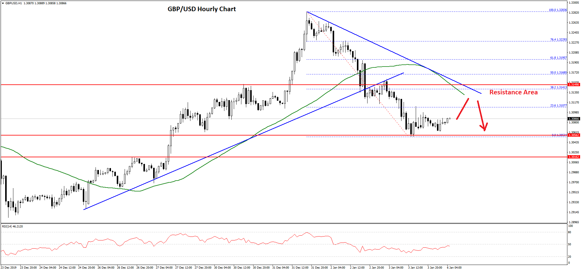 - There was a break below a major bullish trend line with support near 1.3140 on the hourly chart of GBP/USD.