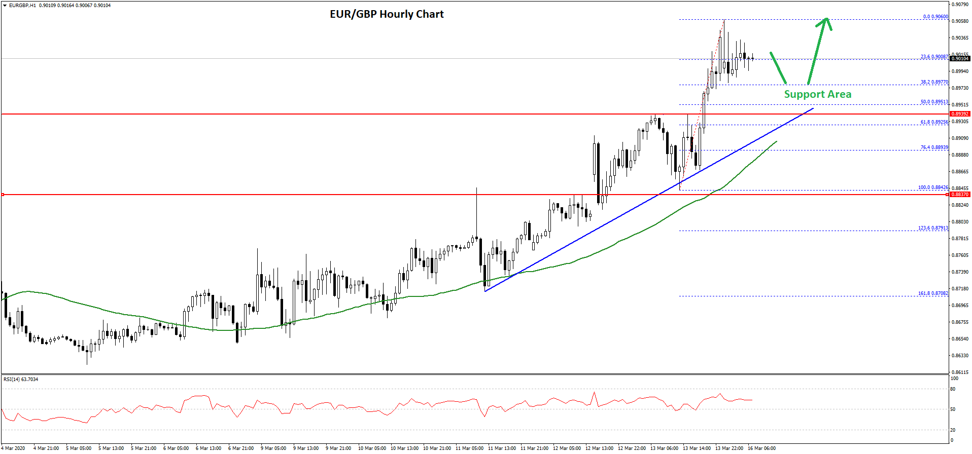 The overall price action is positive for EUR/GBP and if GBP/USD continues to face hurdles, there are chances of more gains in EUR/GBP above the 0.9050 level in the coming days. The next major hurdle is near the 0.9120 level.