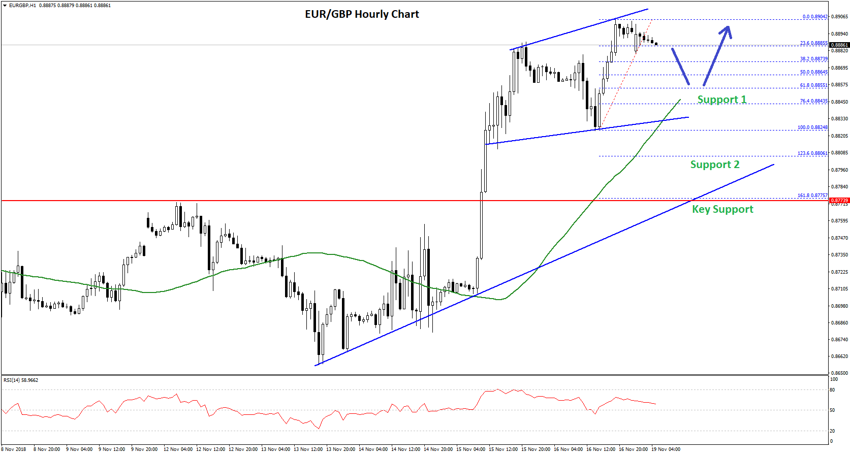 More importantly, there is a major bullish trend line formed with support at 0.8800 on the same chart. Therefore, if the pair corrects lower from the current levels, it will most likely find a strong buying interest near the 0.8860 and 0.8840 levels. The main pivot zone is at 0.8800, below which the pair could move into a bearish zone.