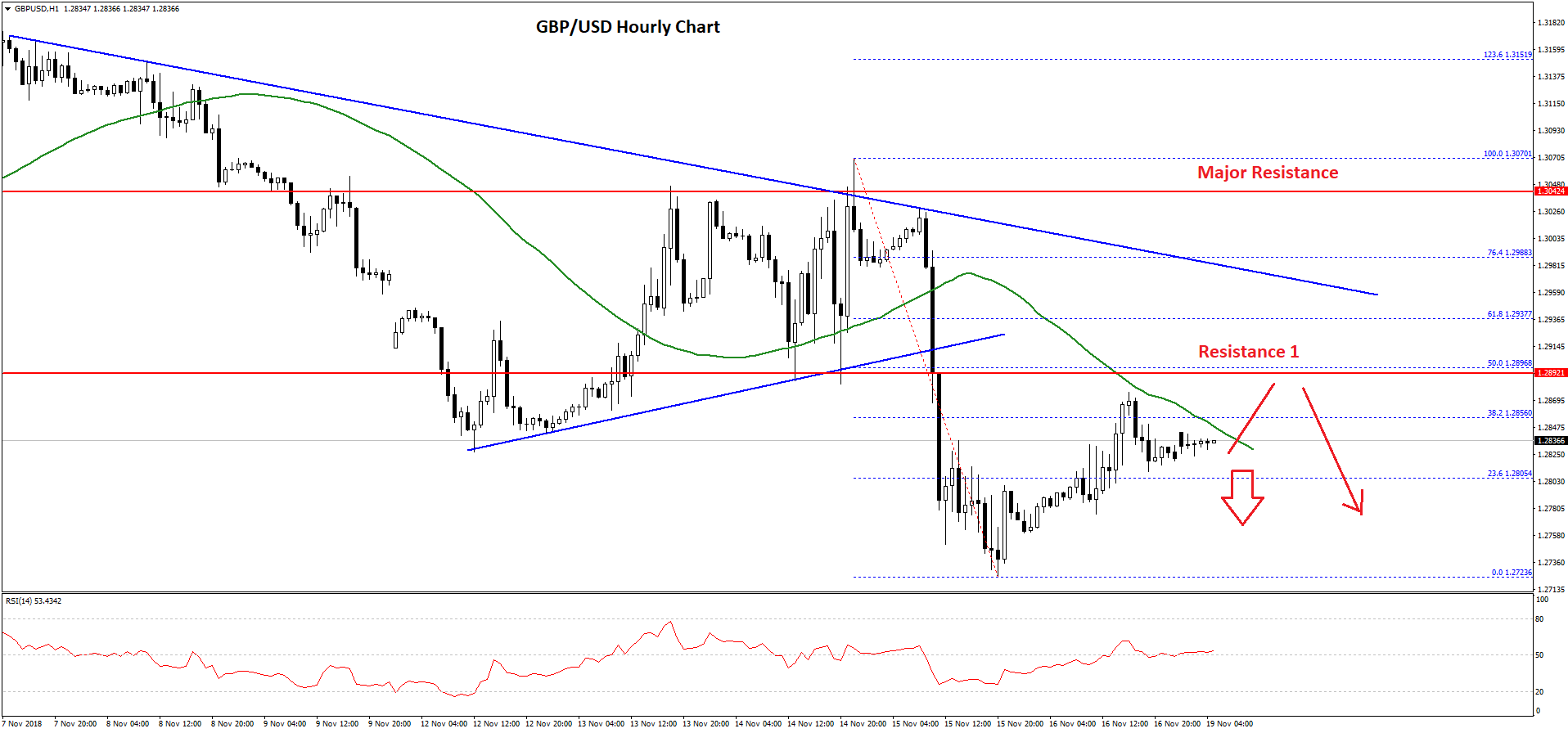 The pair recovered above the 1.2800 resistance and the 23.6% Fib retracement level of the last decline from the 1.3070 high to 1.2772 low. However, the pair seems to be struggling near the 1.2880 level and the 50 hourly simple moving average.
