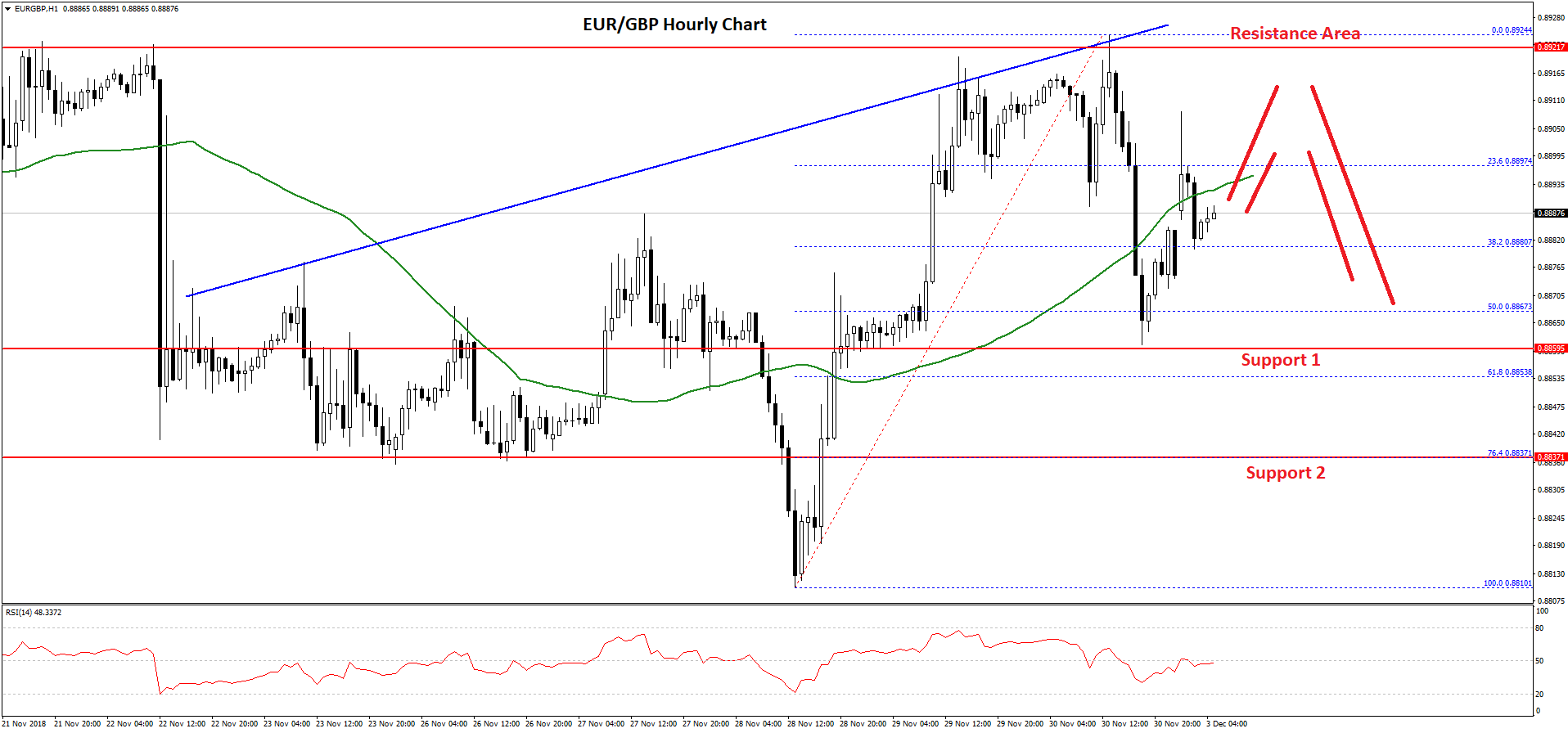 Later, the pair corrected lower and traded below the 0.8900 support area. There was a break below the 38.2% Fib retracement level of the last wave from the 0.8810 low to 0.8924 high. The pair even declined below the 0.8880 support level and the 50 hourly simple moving average.