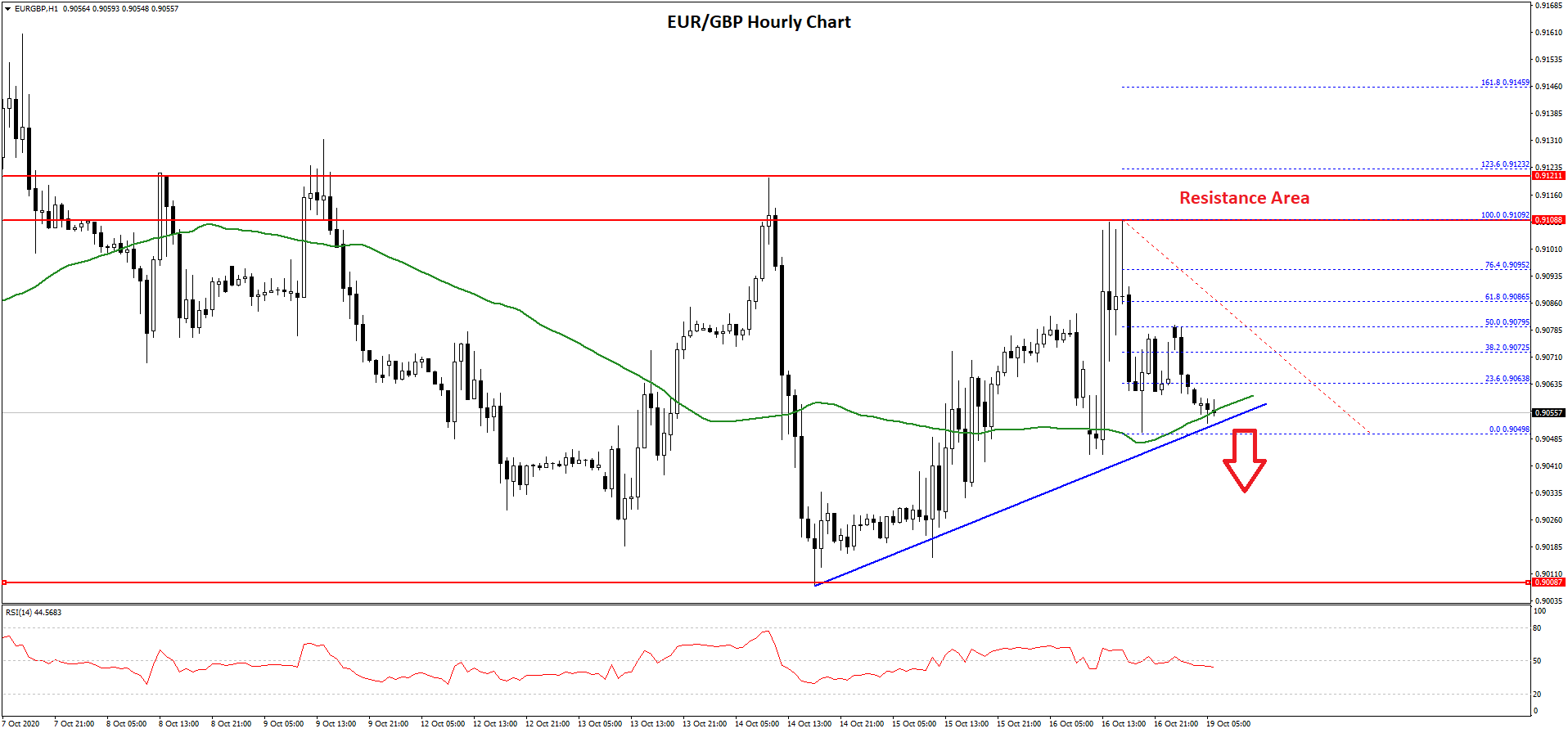 The Euro faced a strong resistance near the 0.9110 and 0.9120 levels against the British Pound. The EUR/GBP pair declined recently below 0.9100 and traded within a broad range.