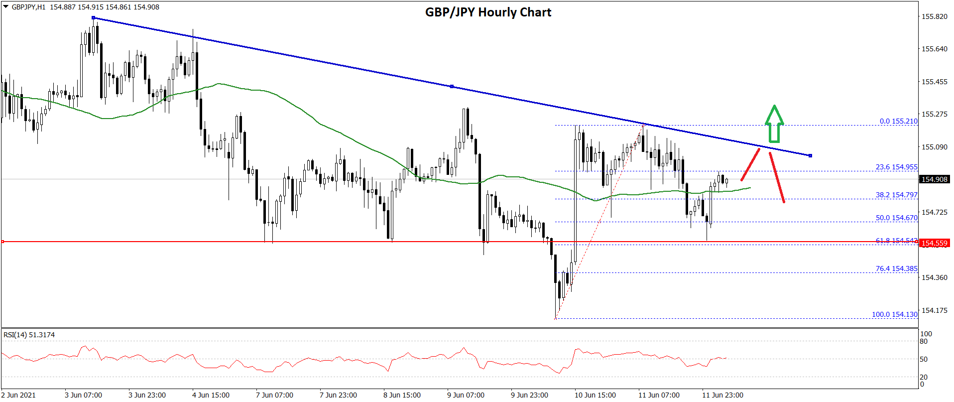 - There is a major bearish trend line forming with resistance near 155.00 on the hourly chart.