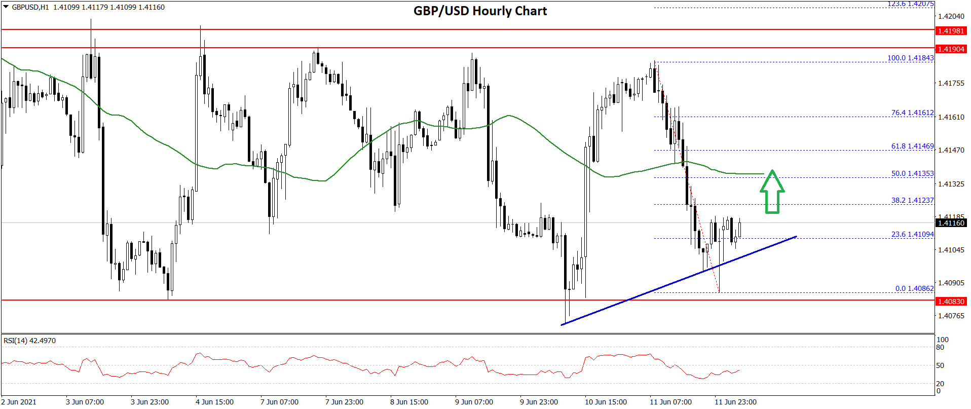 - There is a key bullish trend line forming with support near 1.4100 on the hourly chart of GBP/USD.