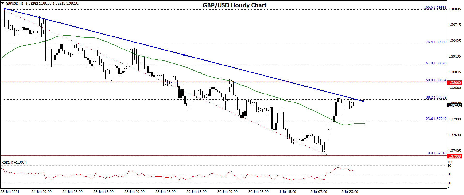 The pair recovered above the 23.6% Fib retracement level of the key decline from the 1.3999 high to 1.3731 low. The pair is now trading above the 1.3800 zone and the 50 hourly simple moving average.