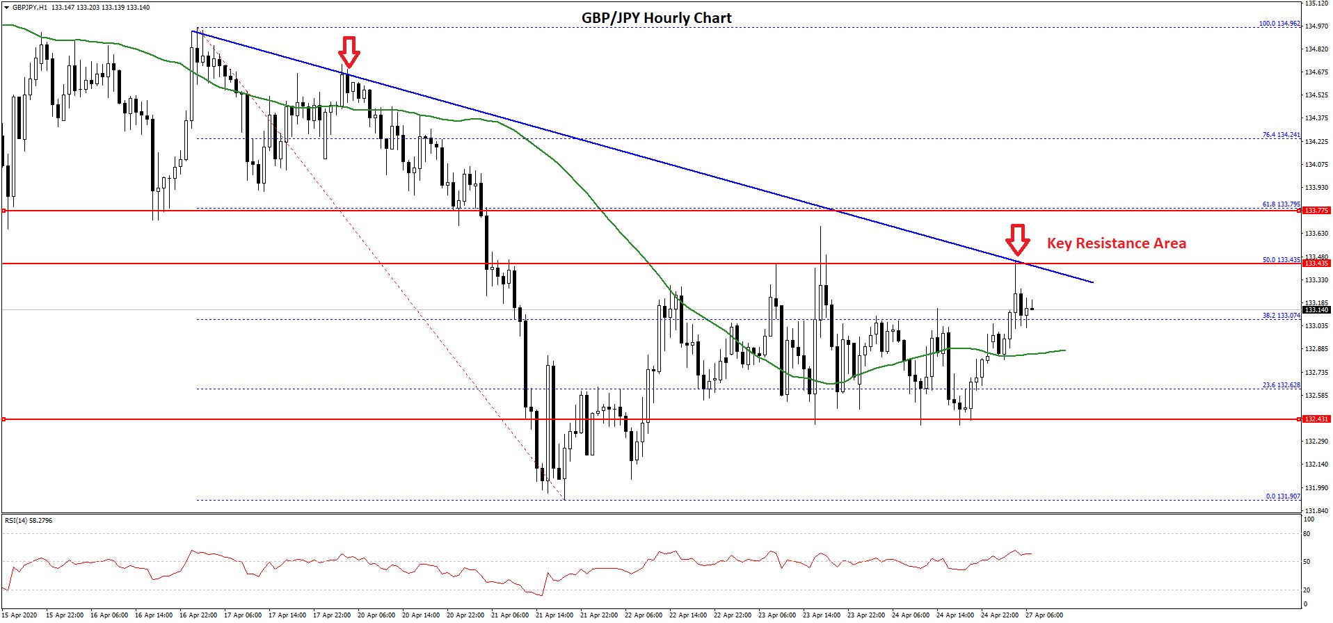 - GBP/JPY is currently facing a strong resistance near the 133.50 and 133.80 levels.