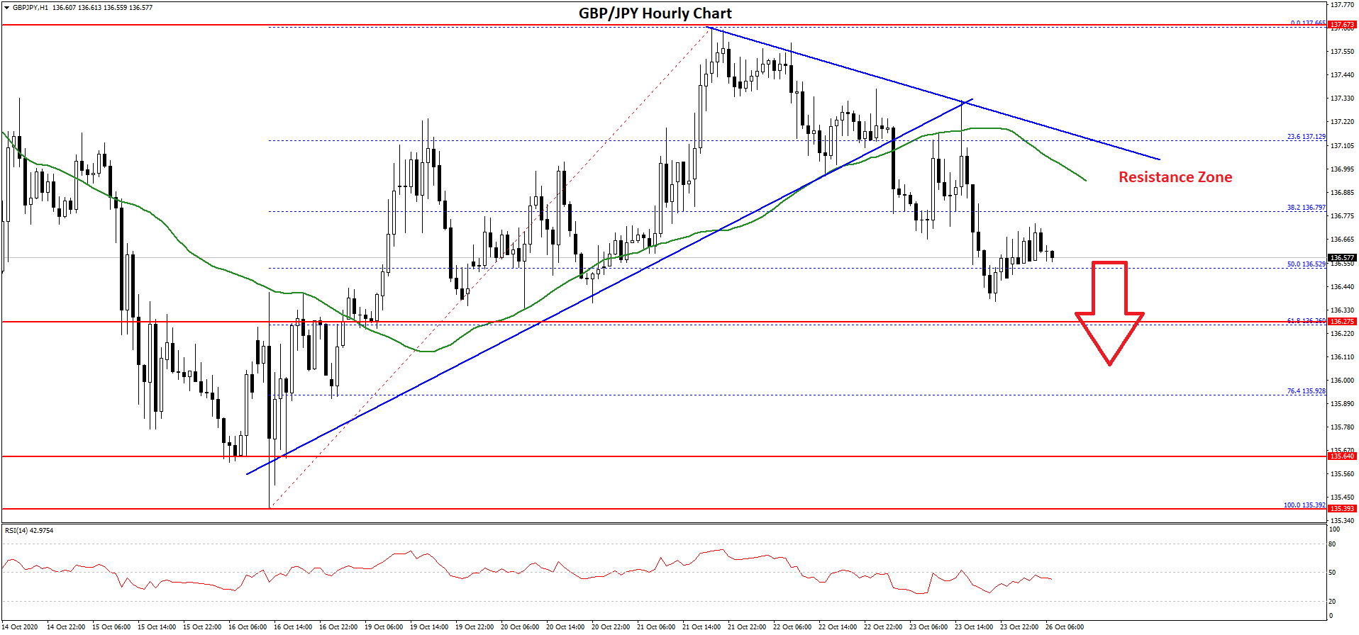 The British Pound also faced a strong resistance near 137.65 and started a fresh decline against the Japanese Yen. The GBP/JPY pair broke the 137.20 support level to move into a bearish zone.